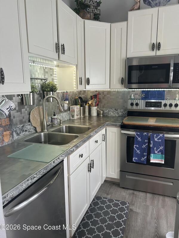 Stunning waterfront corner-unit townhouse in the highly sought-after Malibu Villas! This home features a split-bedroom floor plan with 2 bedrooms and 2 full bathrooms, along with a spacious living room highlighted by a vaulted ceiling. Indoor washer and dryer are included for added convenience. The kitchen offers ample counter and cabinet space, featuring white shaker cabinets, under-cabinet lighting, and a stylish backsplash, along with a sliding glass door that opens to the front porch. Enjoy a cozy private courtyard complete with a storage closet. The primary bedroom overlooks the lake, offering peaceful water views. Property is currently not homesteaded, offering potential tax savings for a buyer who plans to make it their primary residence and apply for homestead exemption. A home warranty is also included and is valid till Feb 2027 for added peace of mind. The community features a pool and sidewalks, and is conveniently located near dining, shopping, and entertainment. View today