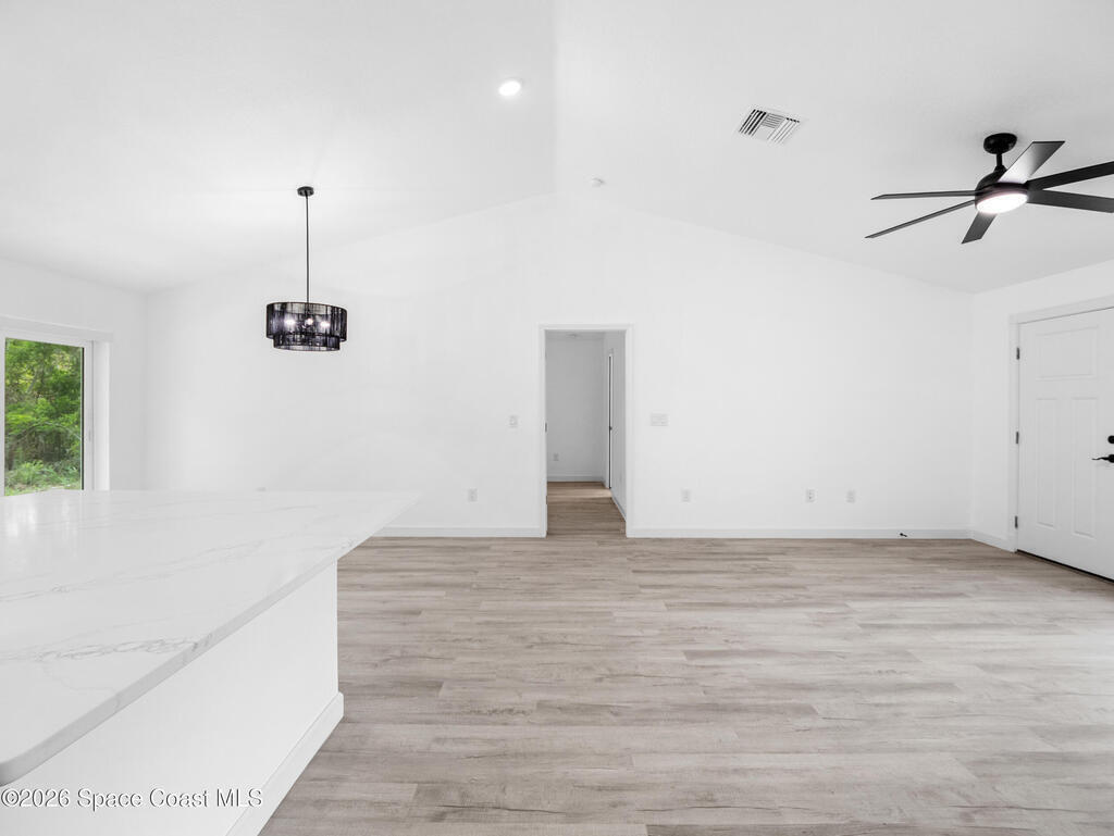 Brand new construction home centrally located in Mims! All hurricane impact windows and sliders! When you walk through the front door you come into an open concept design with a spacious living room, dining room & kitchen with an unique ''L'' shaped island giving extra counter space and cabinet space, quartz countertops and white shaker, soft close cabinets. Corner pantry with plenty of storage. The dining room has a sliding door which brings in great natural light and looks out to the backyard with no neighbors behind you! The primary suite has a generous size bedroom, walk-in closet, linen closet, double vanity and an oversized shower with a sitting bench. Split floor plan with two more bedrooms and a bathroom on the other side of the house with a spacious laundry room, that has a linen closet and leads to the garage. This property is on a quiet dead end street for privacy and peace.