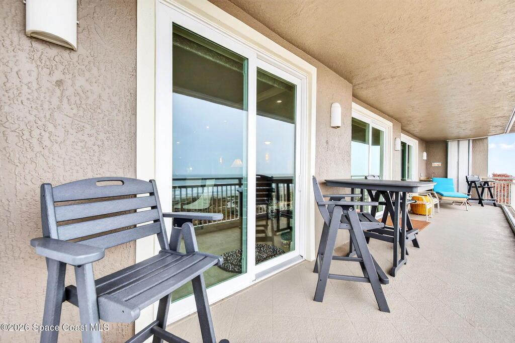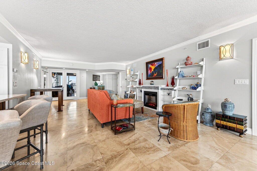 Discover breathtaking ocean and river views from this stunning southeast corner 3-bedroom, 3-bath residence at The Carlyle in South Cocoa Beach. Step directly from the secure elevator into your private vestibule and experience the thoughtful custom details throughout. Flooded with natural light, the spacious open-concept floor plan creates an inviting living environment. The meticulously chef's kitchen features rich wood cabinetry, an oversized island with seating, a gas cooktop with a sleek vent hood, and premium stainless steel appliances. Completely open to the living, dining, and conversation areas, the kitchen offers sweeping views of the ocean and centers around a cozy fireplace.New impact sliding glass doors beautifully frame the picturesque scenery of the ocean and river, while full home shutters provide added peace of mind. Enjoy morning coffee on the east balcony as the sun rises over the Atlantic, and unwind on the west balcony with spectacular sunset views over the river.
