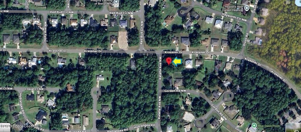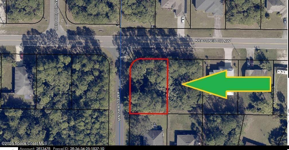 The 0.24 acre [[[ corner ]]] build-able single family residential lot [Rs2 Zoning] is available in Port Malabar Unit #41 of Palm Bay. Located in the northwest section, this lot is located close to the St Johns Heritage Parkway, and is just 2.8 miles - 6 minutes to Heritage High School, 3.5 miles -8 minutes to the Winn Dixie Supermarket, 15.4 miles - 27 minutes to Melbourne International Airport, and 17.8 miles - 32 minutes to the beaches of Indialantic. From exit #176 of I-95, go west on Palm Bay Road NE for .7 miles, left on Minton Road for 2.5 miles, right on Malabar Road for 2.7 miles, and left on Krassner Drive. Go to the corner of Krassner and Katela.