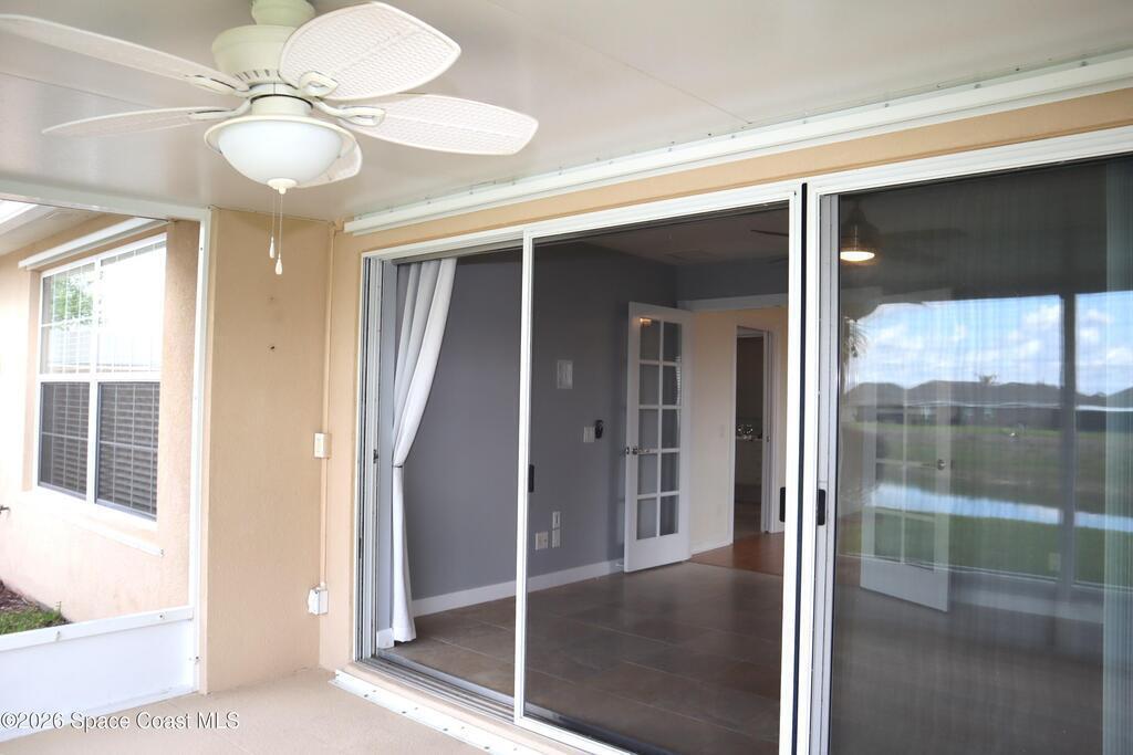 Don't miss this gem in the Beautiful Lakes at Waterstone! Perfect lot on the lake to watch Sunsets on the private screened Lanai and enjoy our refreshing coastal breezes. Quality constructed, the home design and upgrades here make this home a Must See. Spacious layout with volume ceilings, recessed lighting and loads of natural light. In addition to the living room and family room/dining area, there's a bonus room with French Doors with many possibilities. Large bedrooms w/ walk-in closets. Bathrooms are upgraded with marble counters, under cabinet lighting and ceramic tile showers. 2nd bedroom and bath has a Privacy door if en-suite is desired. Open Kitchen has Corian Counters, Tile backsplash, updated appliances and upgrades in the cabinetry for easy living. Large pantry & Laundry room with a handy tub-sink and cabinetry. Driveways and walkways are brick pavers and the community is rich with nice landscaping, stone bridges, walking paths and lake life. Schedule your tour today