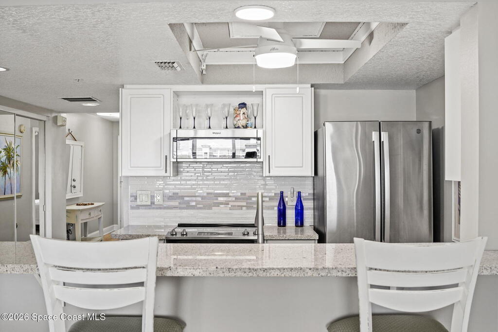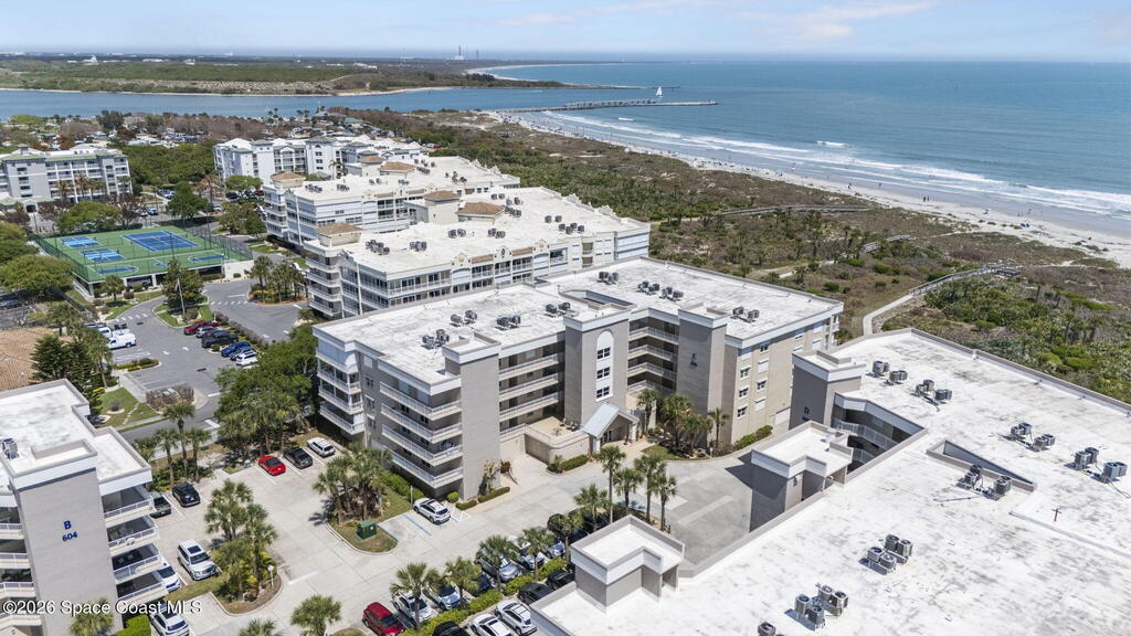 Tucked away in a gated Cape Canaveral community, this updated condo offers privacy with unbeatable convenience--just minutes from restaurants and Jetty Park. Inside, natural light fills the space, highlighting matching vinyl flooring throughout. The modern kitchen features quartz countertops, stainless steel appliances, and a breakfast bar overlooking the family room. The bedroom includes plantation shutters and an updated, spacious bath with a walk-in shower. Step onto the oversized balcony (with NEW hurricane shutter) to relax with ocean breezes and enjoy weekly cruise ship views. Amenities include a clubhouse, tennis and pickleball courts, plus a heated pool and spa. Complete with newer A/C and a private 1-car garage under the building. All concrete restoration has been completed!