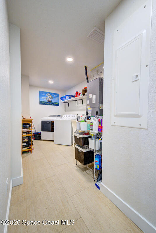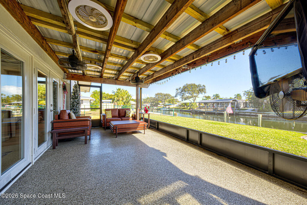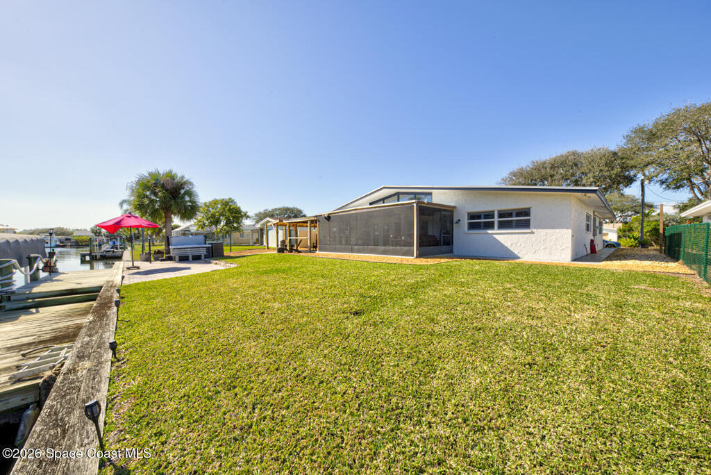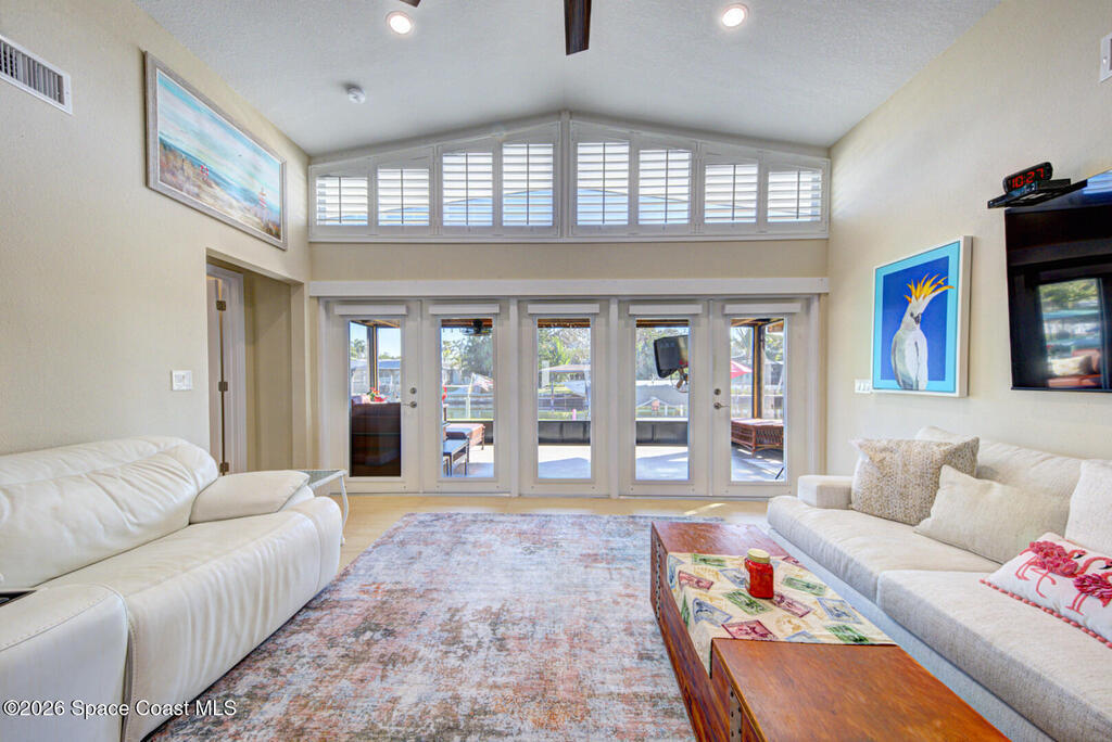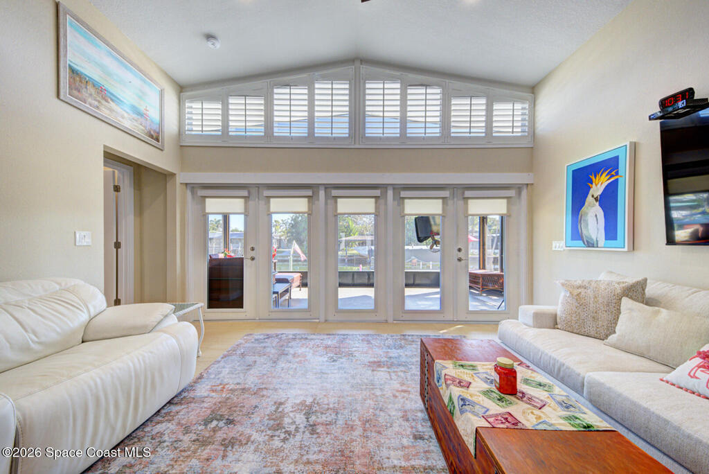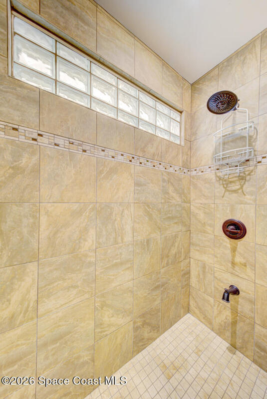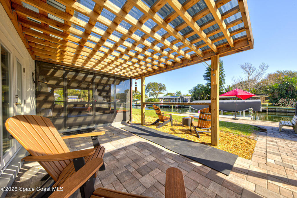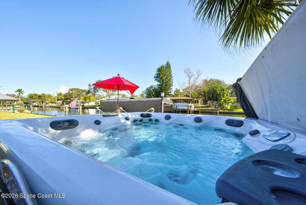 Luxury canal-front living in desirable Surfside neighborhood of Cocoa Beach--NO HOA. This beautifully designed 4-bedroom, 3-bath home features double-primary suites and direct access to a waterfront lifestyle with private floating dock. The open floor plan is filled with natural light and seamless indoor-outdoor flow. The kitchen, dining, and great room connect effortlessly, offering tranquil water views. The kitchen boasts SS appliances, abundant cabinetry, ample counter space, and recessed lighting. Elegant tile flooring imported from Ukraine runs throughout, complemented by plantation shutters and hurricane-rated windows, doors, and garage door. Primary suite provides a retreat with a spa-like bath, double-sink vanity, shower, and soaker tub. Highlights include epoxy-coated driveway and garage with extensive storage, solar panels producing approx. 3, 000 kWh/month. A fenced backyard, screened patio, pergola, garden arbor, hot tub are perfect for boating and year-round enjoyment.