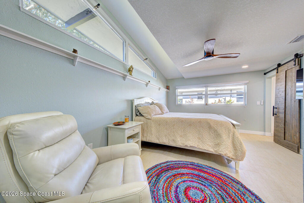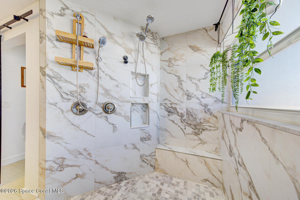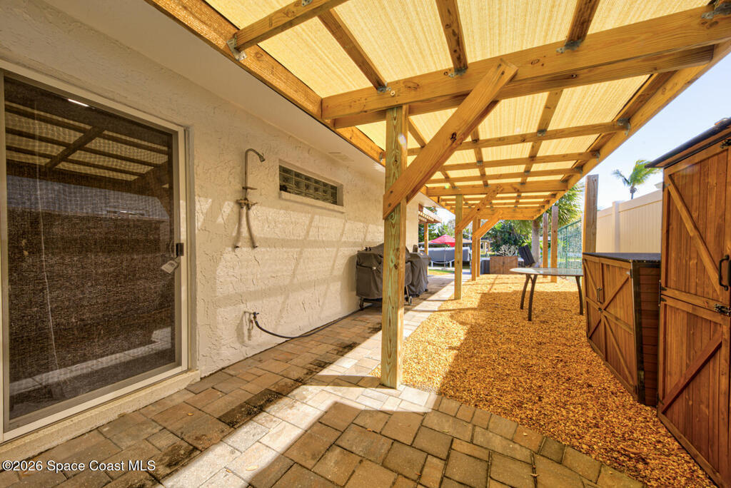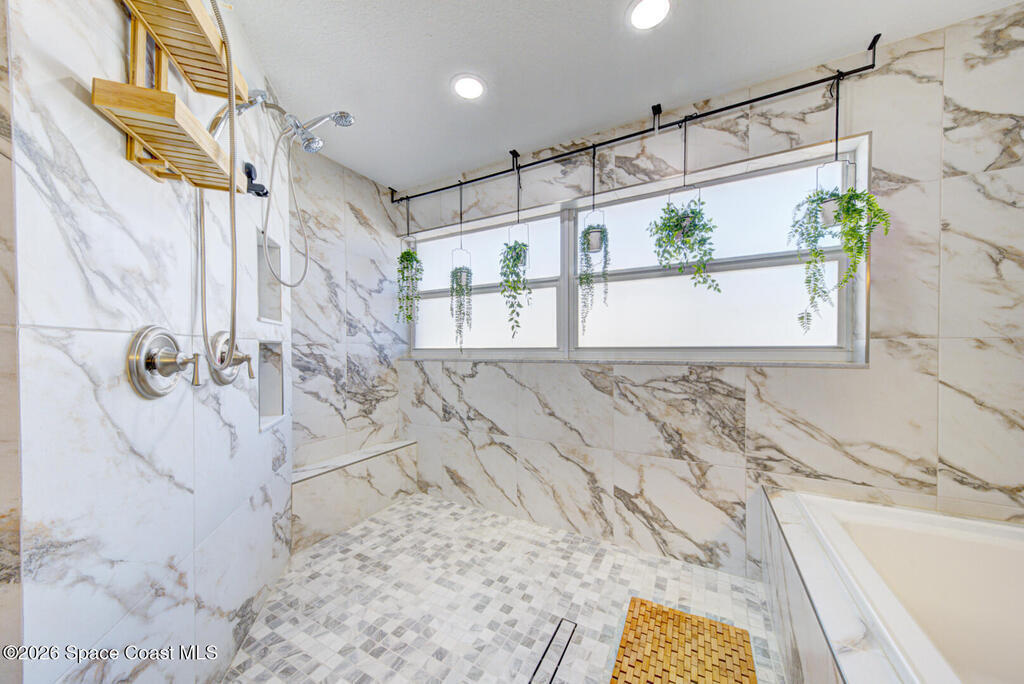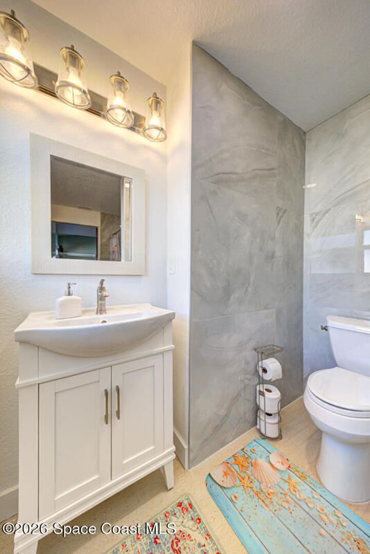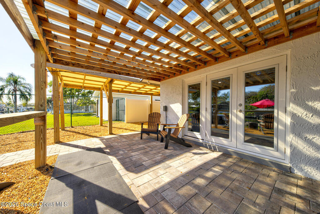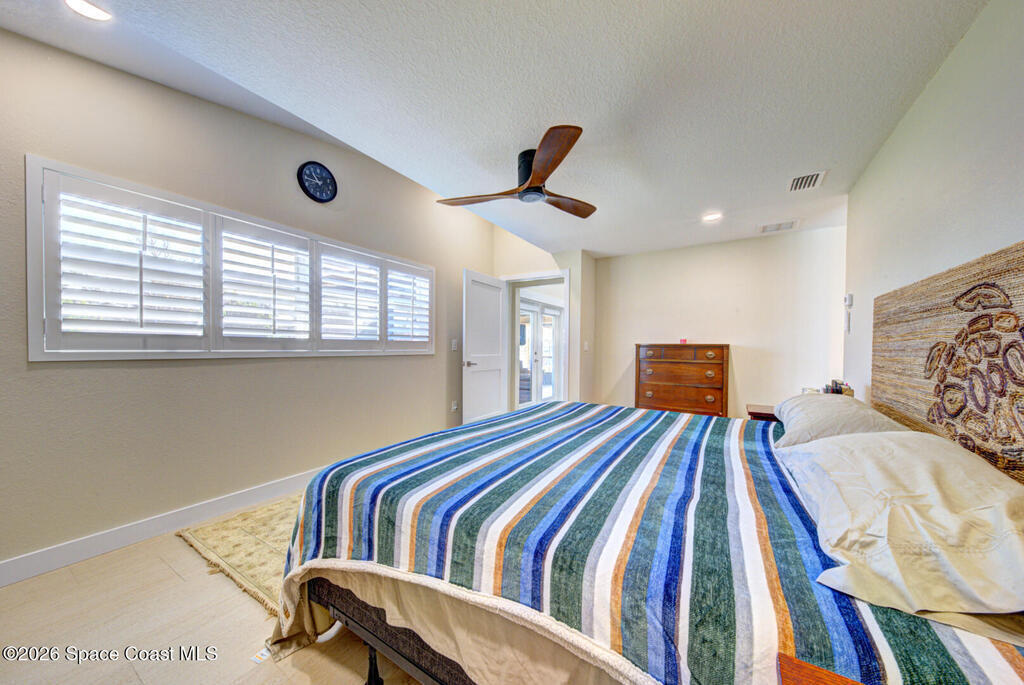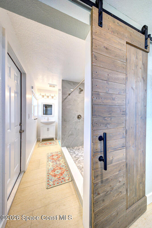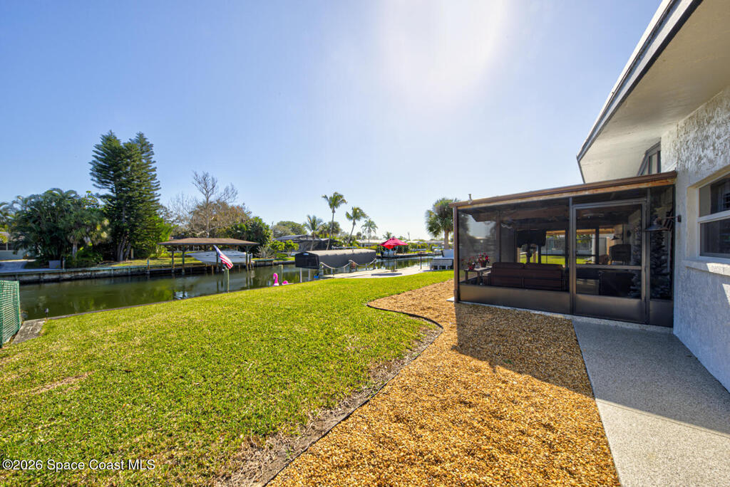 Luxury canal-front living in desirable Surfside neighborhood of Cocoa Beach--NO HOA. This beautifully designed 4-bedroom, 3-bath home features double-primary suites and direct access to a waterfront lifestyle with private floating dock. The open floor plan is filled with natural light and seamless indoor-outdoor flow. The kitchen, dining, and great room connect effortlessly, offering tranquil water views. The kitchen boasts SS appliances, abundant cabinetry, ample counter space, and recessed lighting. Elegant tile flooring imported from Ukraine runs throughout, complemented by plantation shutters and hurricane-rated windows, doors, and garage door. Primary suite provides a retreat with a spa-like bath, double-sink vanity, shower, and soaker tub. Highlights include epoxy-coated driveway and garage with extensive storage, solar panels producing approx. 3, 000 kWh/month. A fenced backyard, screened patio, pergola, garden arbor, hot tub are perfect for boating and year-round enjoyment.