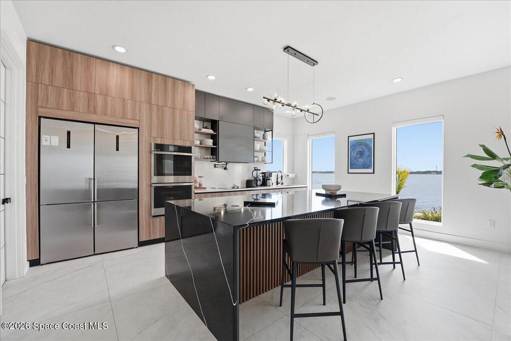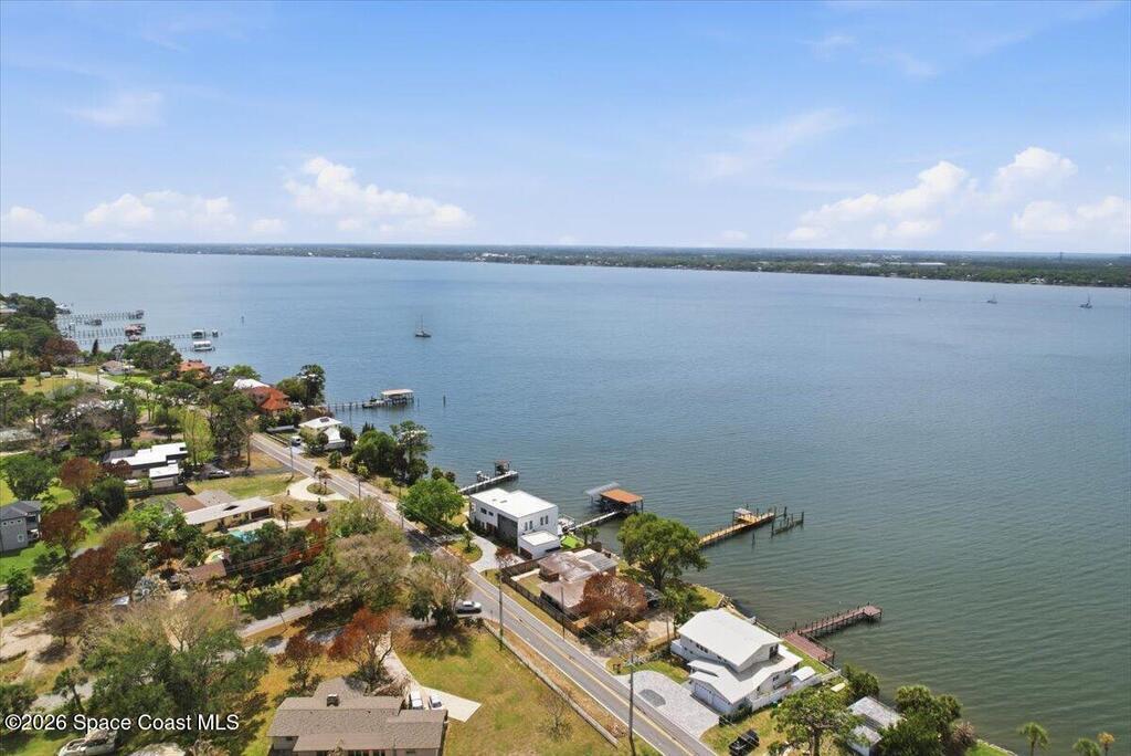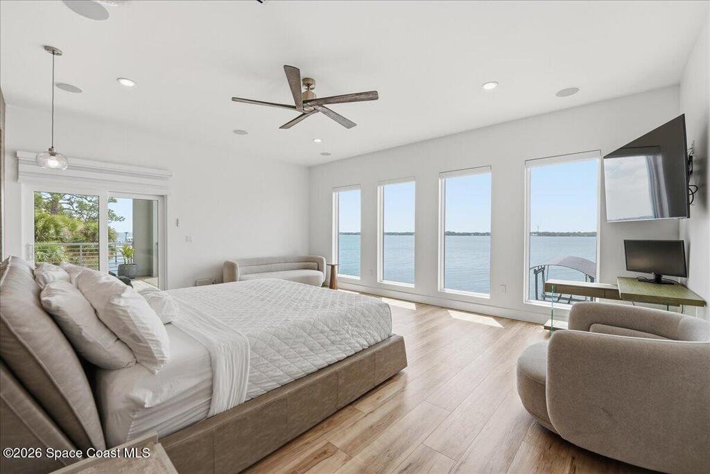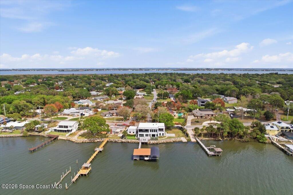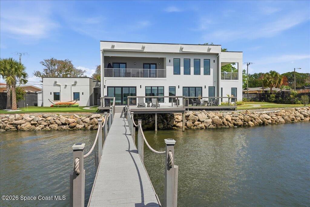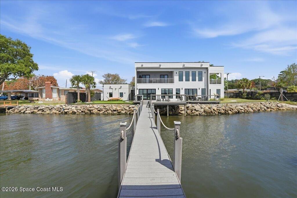 Modern Waterfront Masterpiece on Merritt Island with 142 feet of direct Indian River frontage. This 2024-built two-story home features full concrete block construction, a commercial-grade roof, and high-end modern finishes throughout. Offering 5 bedrooms, 4 full baths, and a 2-car garage, this fully furnished residence is truly turnkey. The designer kitchen, custom built-in closets, smart home features, motorized shades, and smart toilets elevate the living experience. The expansive upstairs primary suite includes a private covered terrace, wraparound closet, and a stunning spa bath with designer tile and luxury shower. Enjoy a covered boat dock with lift, jet ski dock, putting green, and side yard. West-facing balconies capture breathtaking sunsets with views of dolphins and manatees. Located near Cocoa Village with quick access to the Atlantic Ocean, 45 minutes to Orlando International Airport and 1 hour to Disney. Truly one of a kind.