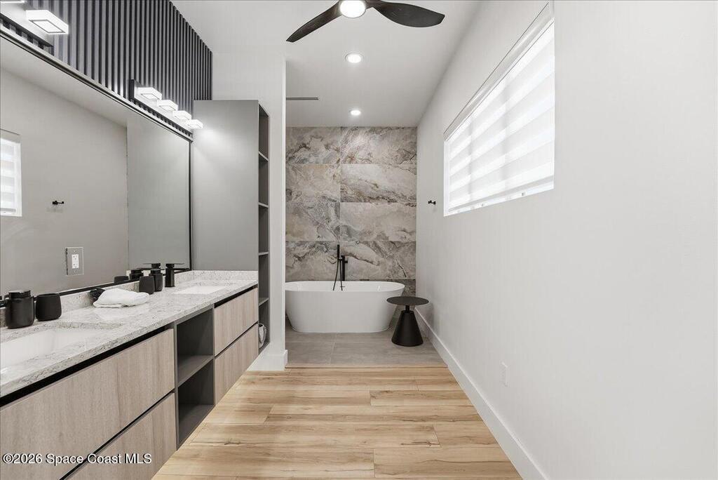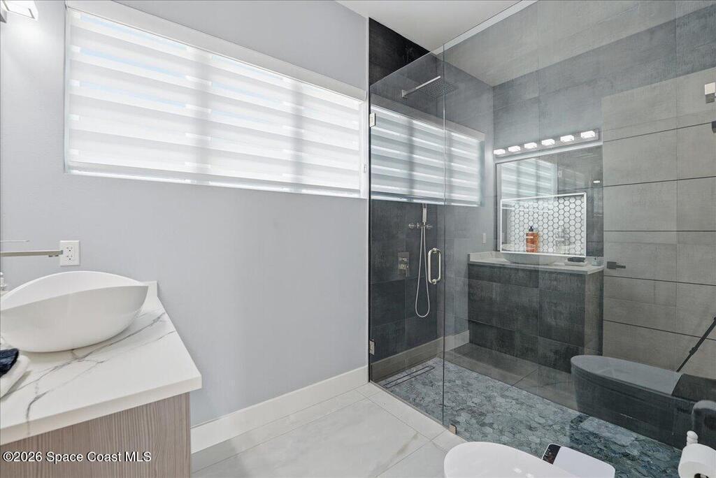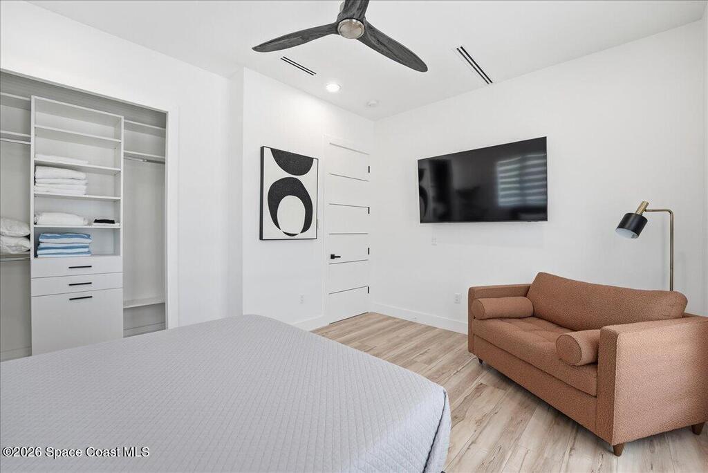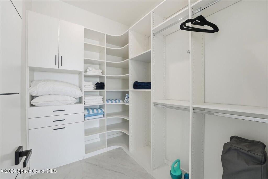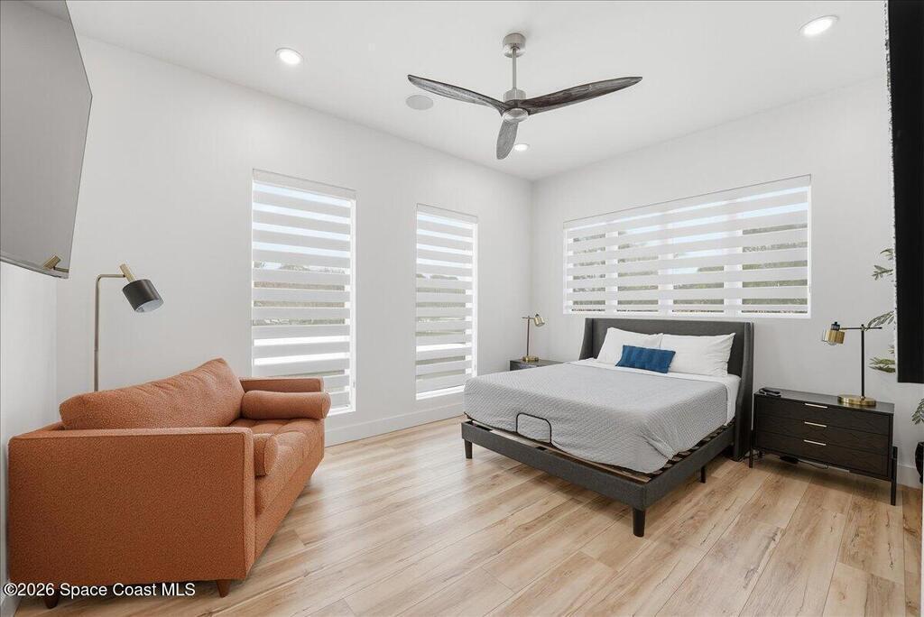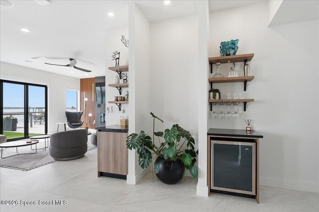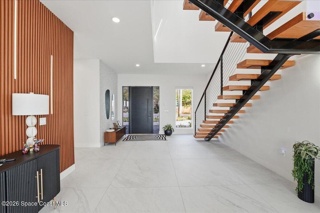 Modern Waterfront Masterpiece on Merritt Island with 142 feet of direct Indian River frontage. This 2024-built two-story home features full concrete block construction, a commercial-grade roof, and high-end modern finishes throughout. Offering 5 bedrooms, 4 full baths, and a 2-car garage, this fully furnished residence is truly turnkey. The designer kitchen, custom built-in closets, smart home features, motorized shades, and smart toilets elevate the living experience. The expansive upstairs primary suite includes a private covered terrace, wraparound closet, and a stunning spa bath with designer tile and luxury shower. Enjoy a covered boat dock with lift, jet ski dock, putting green, and side yard. West-facing balconies capture breathtaking sunsets with views of dolphins and manatees. Located near Cocoa Village with quick access to the Atlantic Ocean, 45 minutes to Orlando International Airport and 1 hour to Disney. Truly one of a kind.
