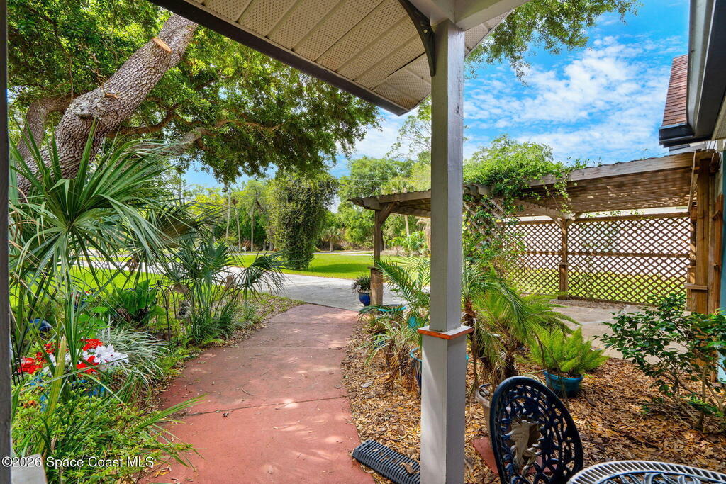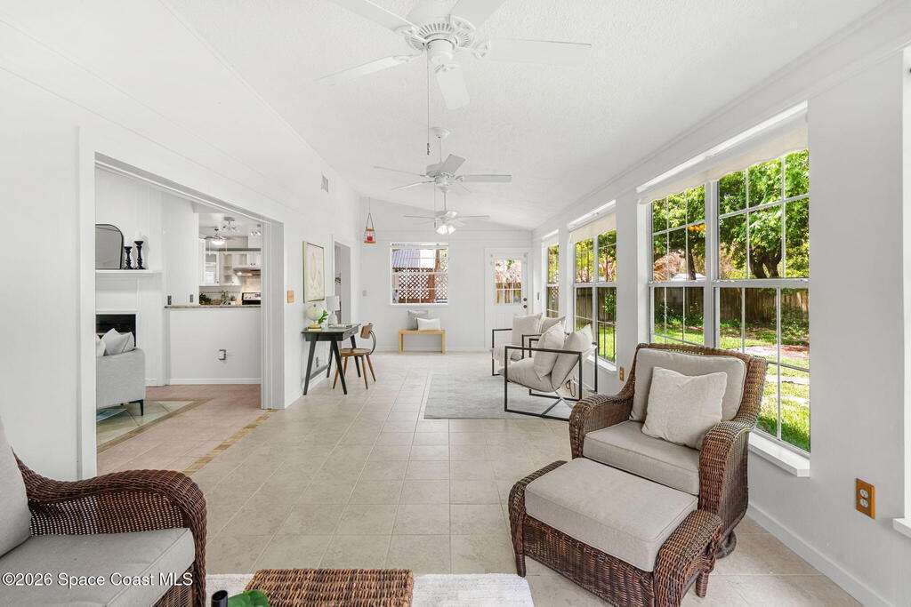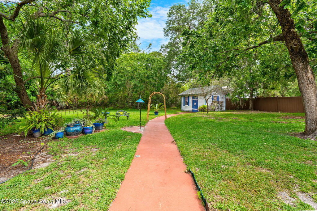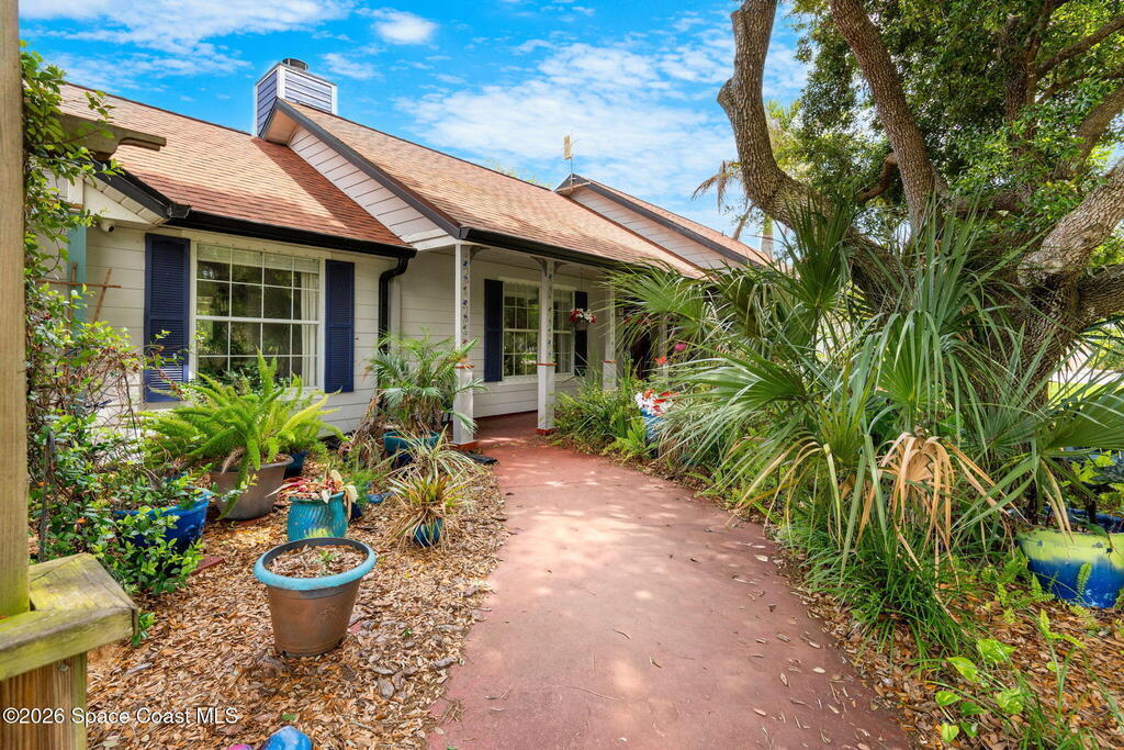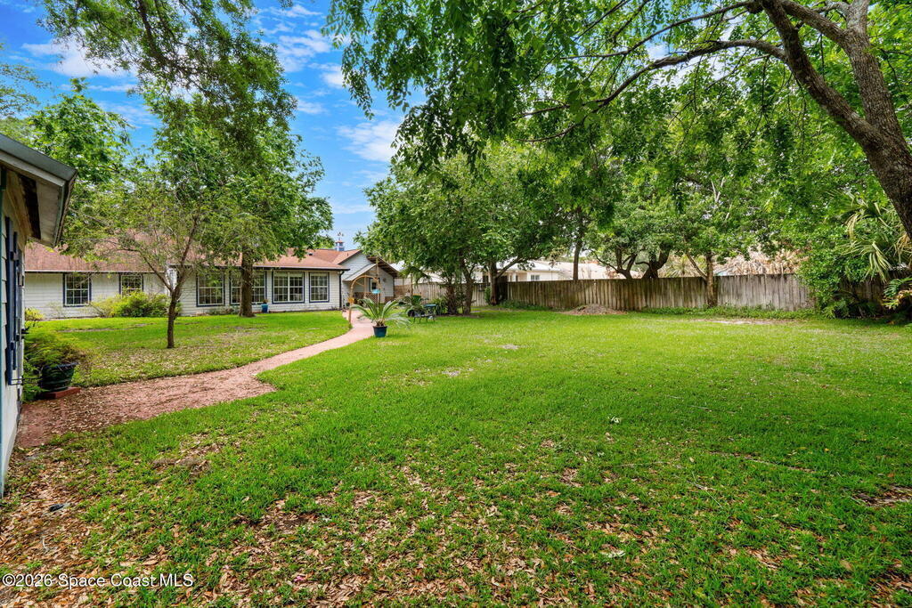 Charming 4 bed 2 bath custom built home with Southern style appeal on over a half acre lot! (NO HOA) Features include: living room with vaulted ceilings and wood burning fireplace, formal dining room, kitchen with stainless steel appliances, granite counters and two toned cabinets, and a light filled 12x30 sunroom with vaulted ceiling and wood laminate flooring. The spacious primary bath includes a Jacuzzi tub and solid surface integrated sinks. Outdoor features include a beautiful yard with mature trees, butterfly garden, walkway, sprinkler system and storage shed/workshop. Additional highlights include HardiePlank siding, storm shutters, 2 car garage, roof 2019, A/C 2019, water heater 2024 and dishwasher 2024. A rare opportunity to enjoy space, character and thoughtful updates in Cocoa.