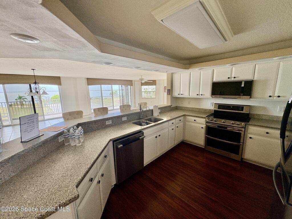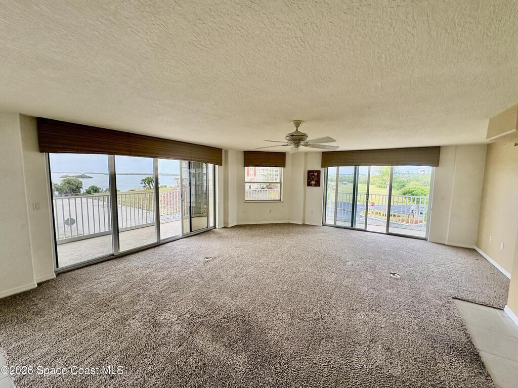 GORGEOUS DIRECT RIVER FRONT 3 bedrooms / 2 bathrooms condo in Puerto Del Rio complex. Spacious kitchen with stainless steel appliance, breakfast bar, open floor plan, ceiling fans, private wrap around balcony with storm shutters, under bldg 1 car garage, and walk-in laundry room with washer & dryer. 2 walk-in closets, double sink vanity, walk-in shower with a separate tub in master suite. Complex offers fenced in-ground community pool, river access, open parking, clubhouse, and secured lobby & elevator entrance. Wonderful and quiet neighborhood. XLNT location with easy access to Port Canaveral, KSC, restaurants, services & amenities, entertainment, Publix grocery, 520, 528, Ron Jon Surf shop, downtown Cocoa Beach, and about an hour to Orlando/ attractions!