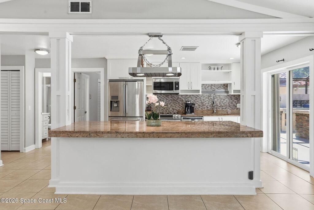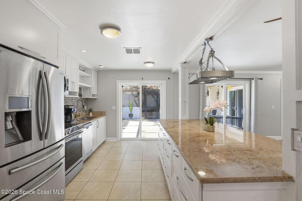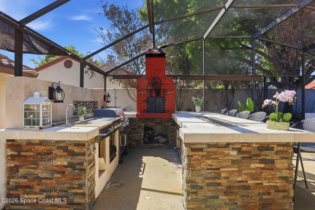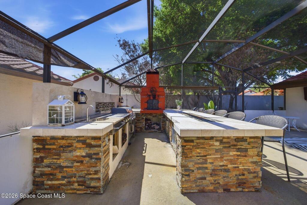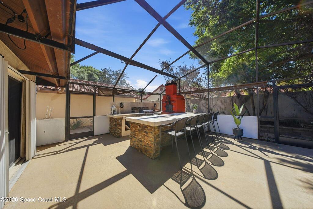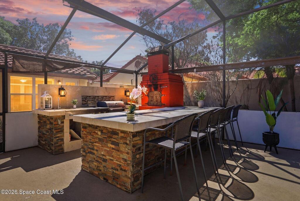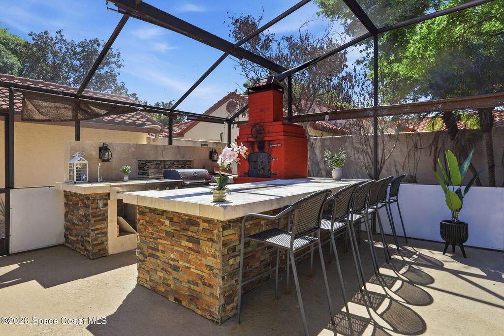 Location, Location, Location! Nestled on a quiet cul-de-sac in the desirable Granada Villas community, this updated Dr. Phillips home is move-in ready. Inside, you will find modern finishes throughout, including luxury vinyl flooring and ceramic tile with no carpet. The beautifully updated kitchen features granite countertops, sleek cabinetry, and stainless steel appliances, while bathrooms have been stylishly renovated. The primary suite includes a walk-in tiled shower and double vanity, and the second bedroom includes a walk-in closet with easy access to the shared bath. Natural light fills the home through sliding glass doors that connect multiple rooms to a screened patio. Step outside to a private oasis featuring an inviting space with an outdoor kitchen, a large island, TV areas, and a pizza oven; perfect for everyday living and gathering. The community has access to Little Sand Lake, a boat ramp, tennis courts, and park areas, all close to shopping, dining, and attractions.