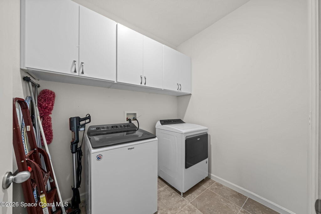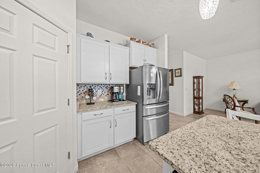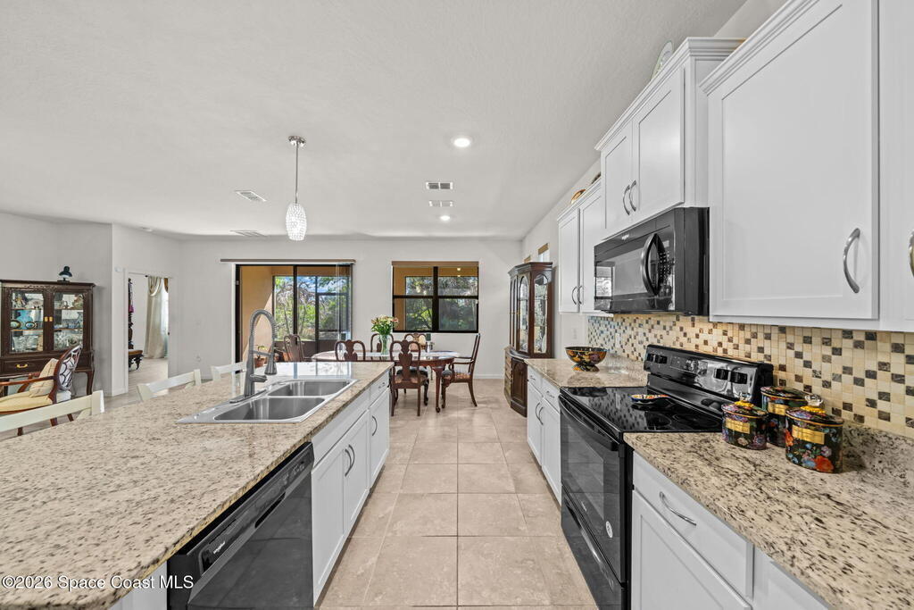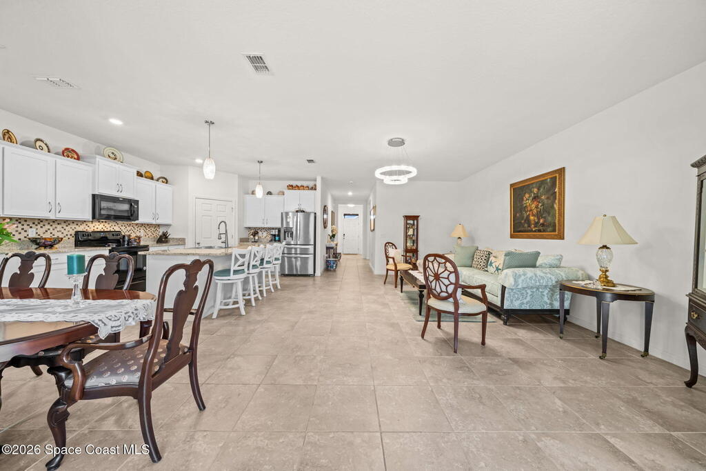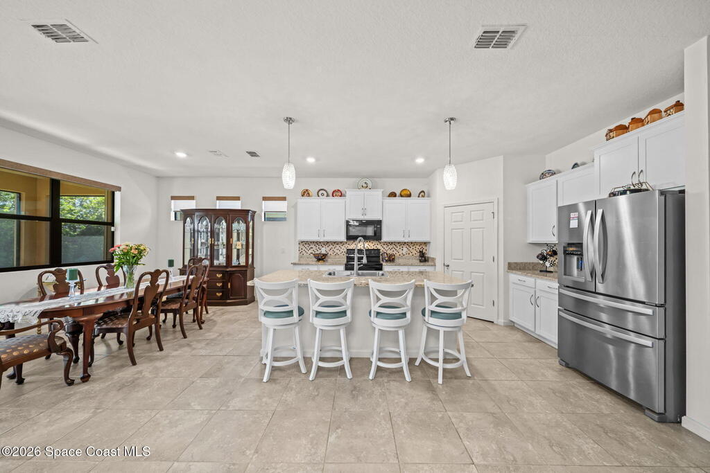 Beautifully upgraded Delray model offering 4 bedrooms (or 3 + flex room), 2 baths, and over 2, 034 sq. ft. of open living space. This home features no carpet, with serene light grey tile throughout main areas and wet spaces. The bright kitchen showcases white cabinetry, Crema Pearl granite countertops, and a full stainless steel appliance package, including a new refrigerator.Upgrades include accordion hurricane shutters, custom window treatments, upgraded lighting, and custom laundry room cabinets with washer and dryer included. The spacious primary suite offers dual walk-in closets, while additional features include comfort-height toilets and energy-efficient bronze windows.Enjoy outdoor living on the 9x23 tiled covered lanai. Located in a community with pool and cabana, plus access to Bayside Lakes amenities. Move-in ready!