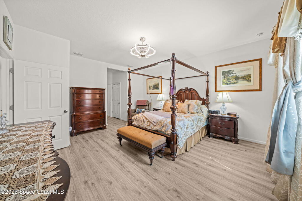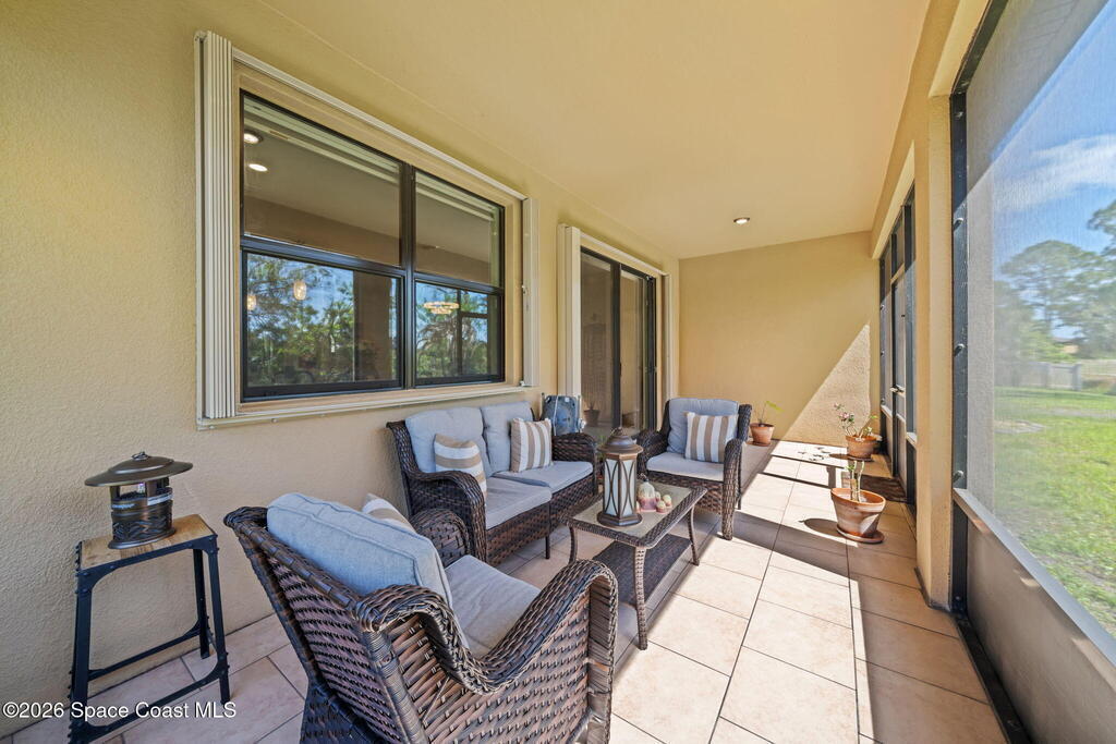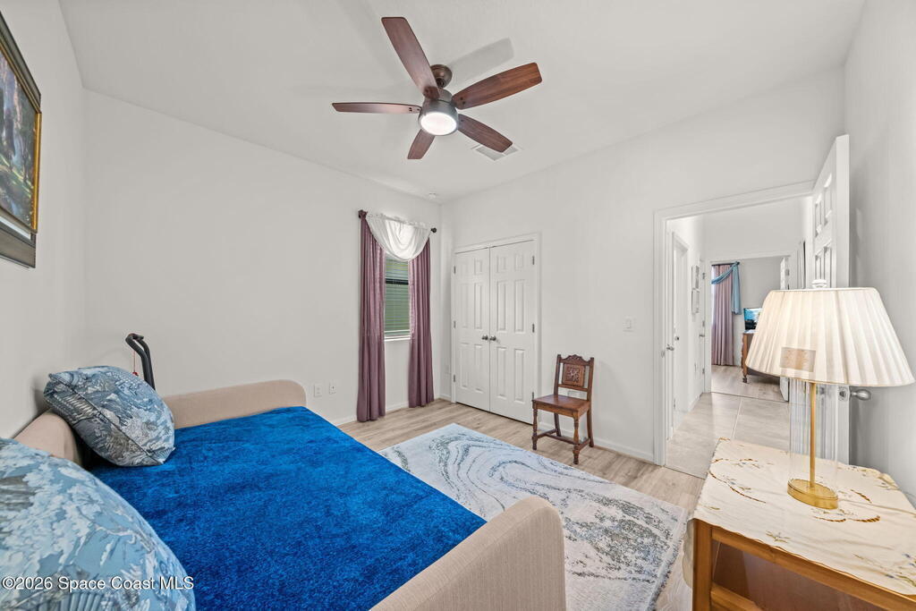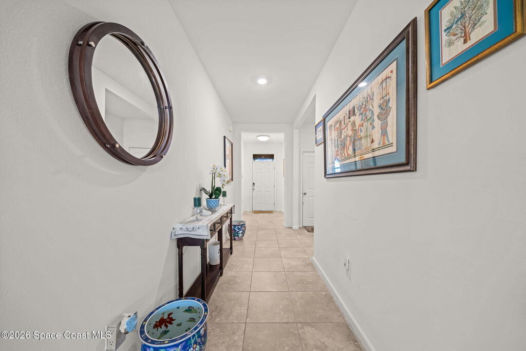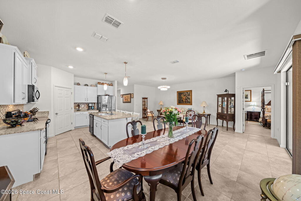 Beautifully upgraded Delray model offering 4 bedrooms (or 3 + flex room), 2 baths, and over 2, 034 sq. ft. of open living space. This home features no carpet, with serene light grey tile throughout main areas and wet spaces. The bright kitchen showcases white cabinetry, Crema Pearl granite countertops, and a full stainless steel appliance package, including a new refrigerator.Upgrades include accordion hurricane shutters, custom window treatments, upgraded lighting, and custom laundry room cabinets with washer and dryer included. The spacious primary suite offers dual walk-in closets, while additional features include comfort-height toilets and energy-efficient bronze windows.Enjoy outdoor living on the 9x23 tiled covered lanai. Located in a community with pool and cabana, plus access to Bayside Lakes amenities. Move-in ready!