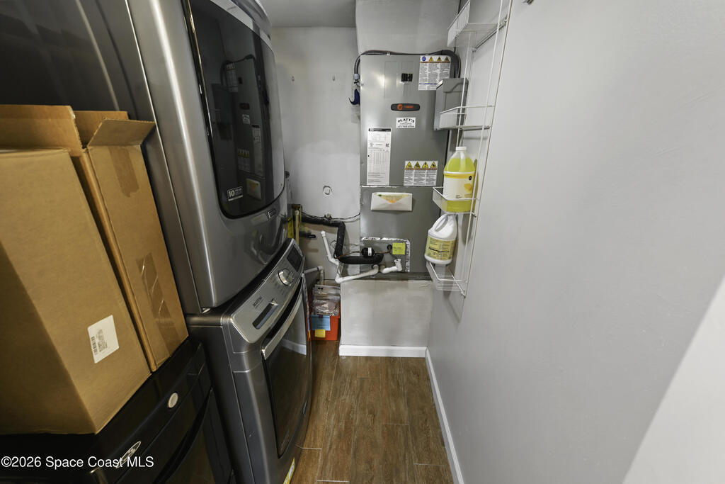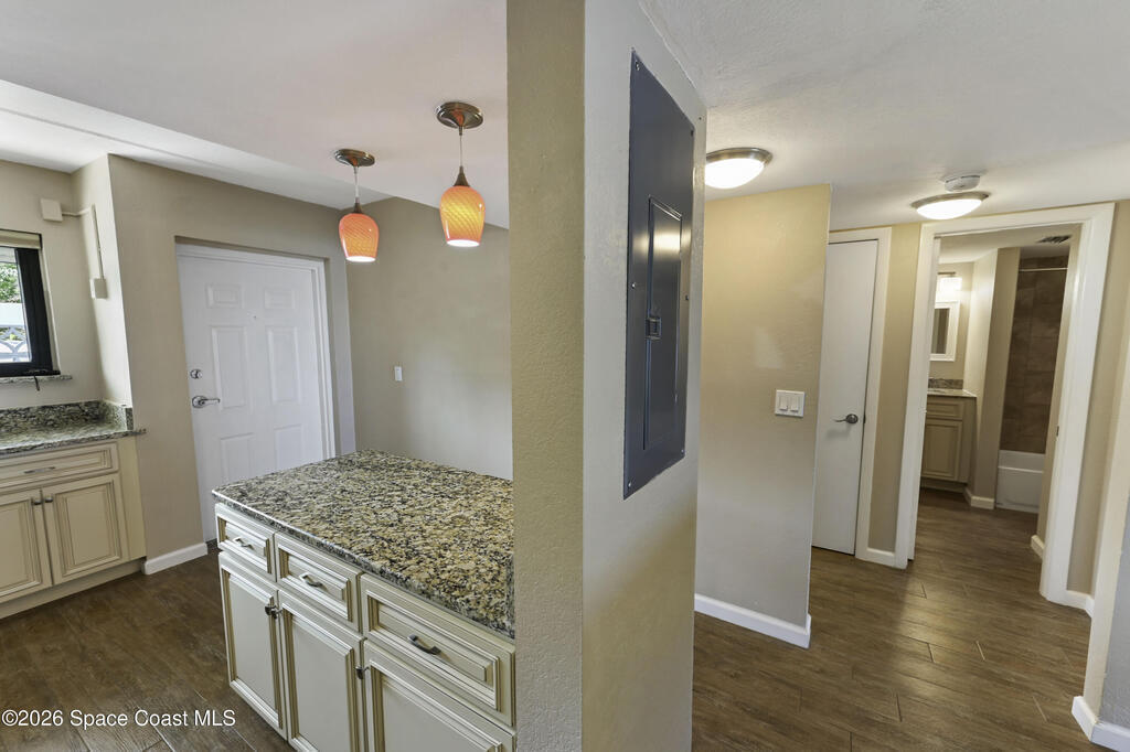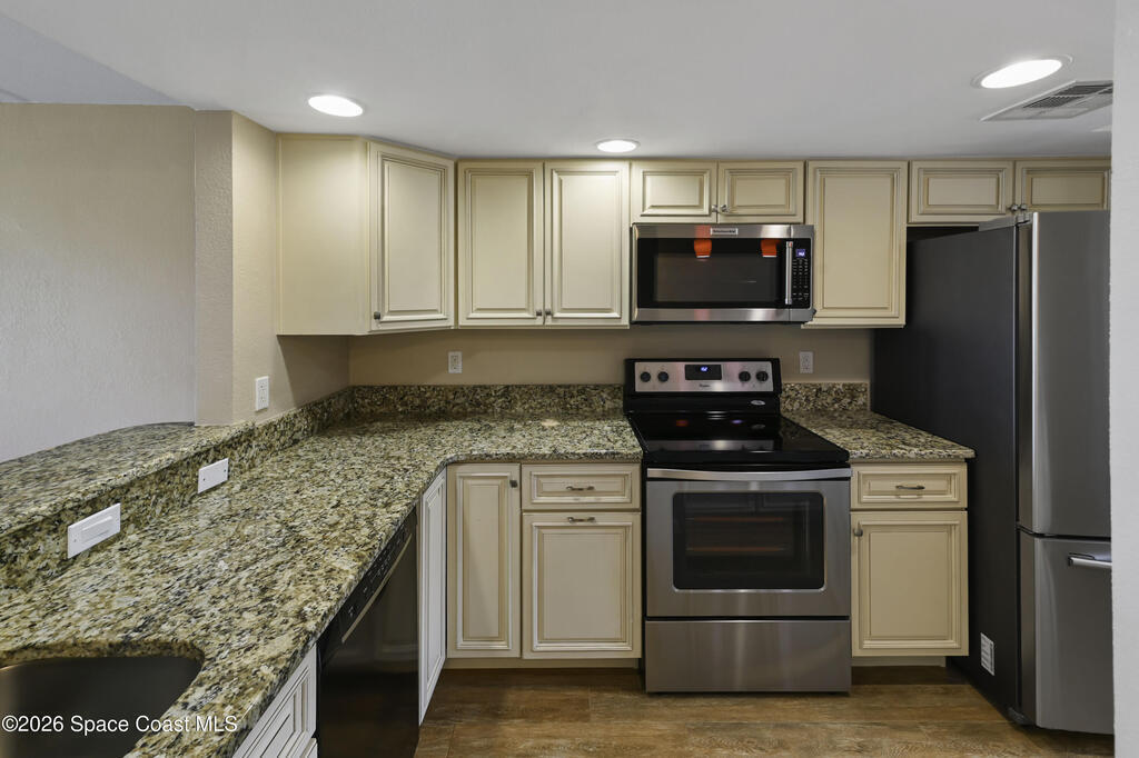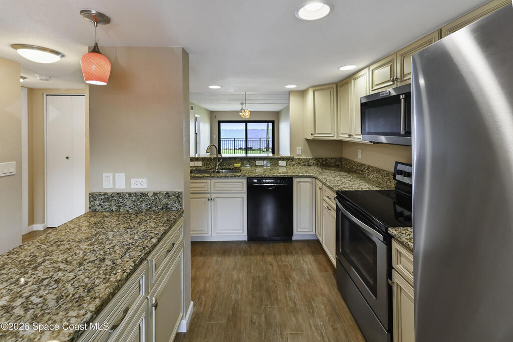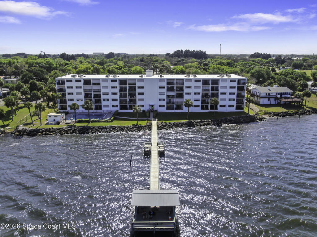 Welcome to this beautifully updated first-floor riverfront condo with stunning water views the moment you walk in. Light and open layout with direct river sightlines creates a peaceful and inviting setting. The kitchen features granite countertops, center island, r, soft-close drawers and recessed lighting, ideal for everyday living & entertaining. Wood-look tile flooring runs throughout for a clean, modern feel. Split floor plan offers 2 spacious bedrooms for added privacy. The primary suite includes a walk-in closet with built-in storage shelves and a large window overlooking the river, with a beautifully remodeled bathroom. Enjoy your private rear porch--perfect for morning coffee or evening relaxation--and hurricane shutters for added peace of mind. Additional features include indoor laundry with washer and dryer, private storage in the lobby, secured lobby access, and one assigned carport space. Community amenities include a pool and pier for true waterfront living. VIEW TODAY