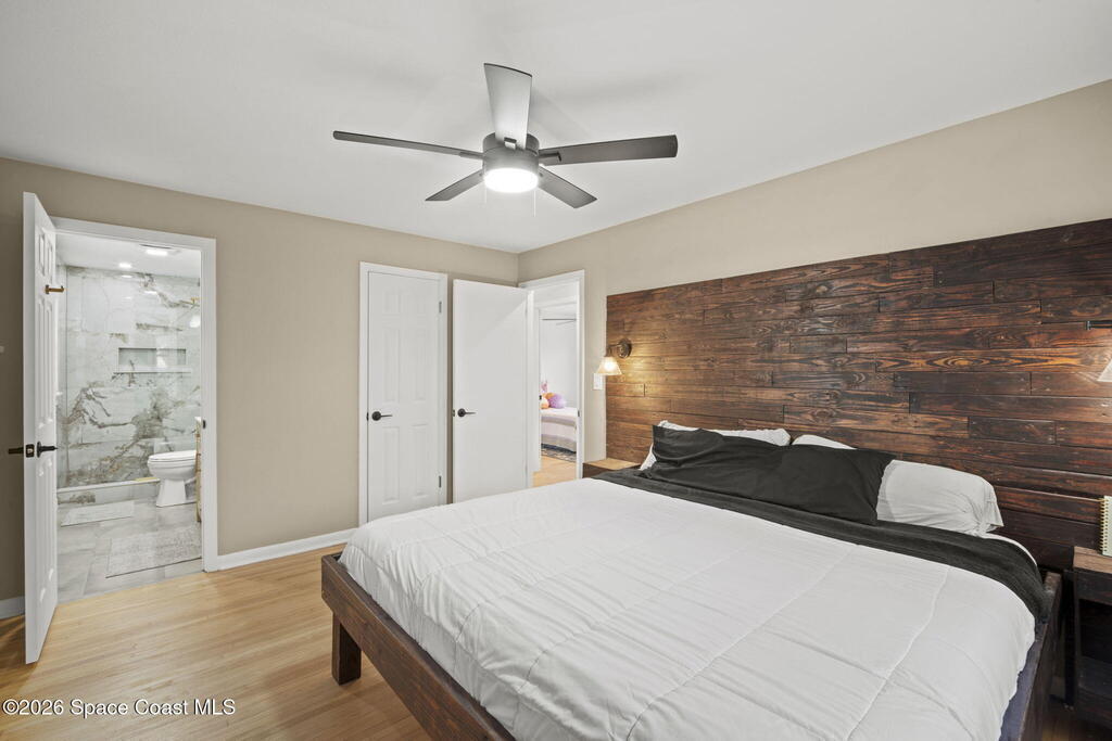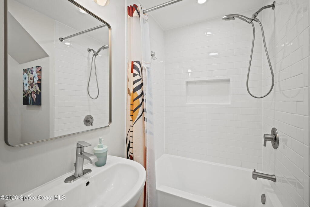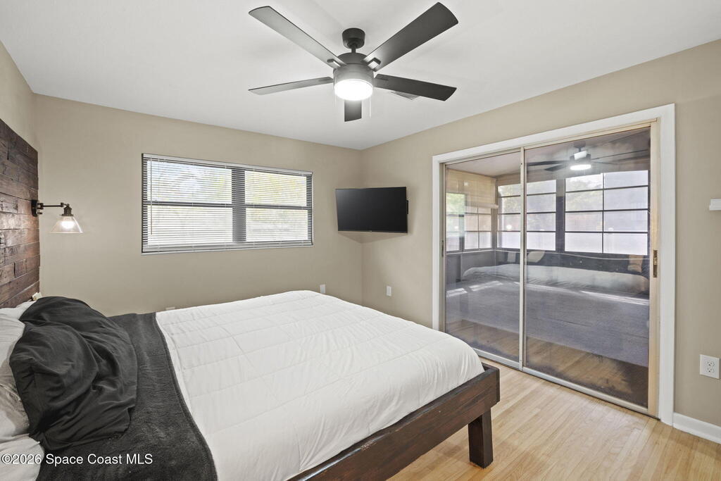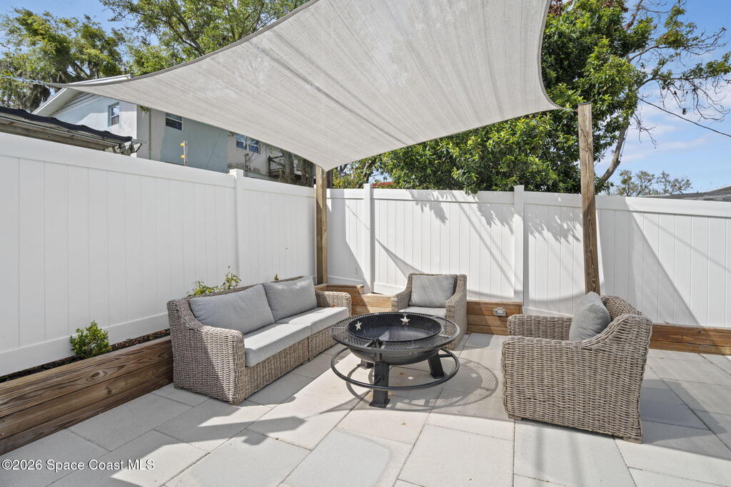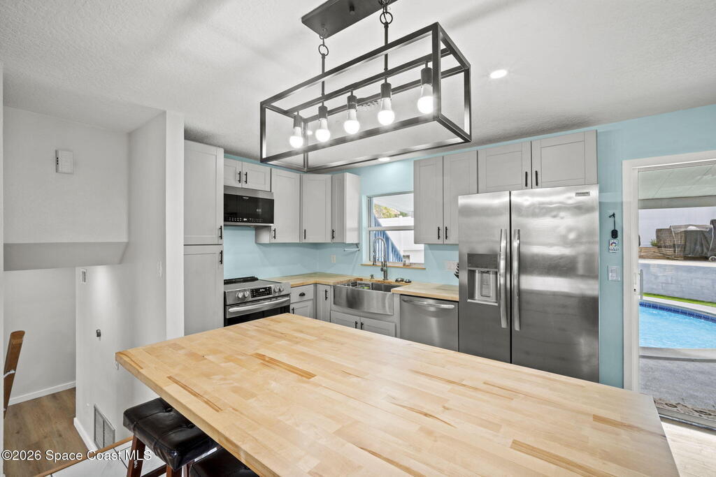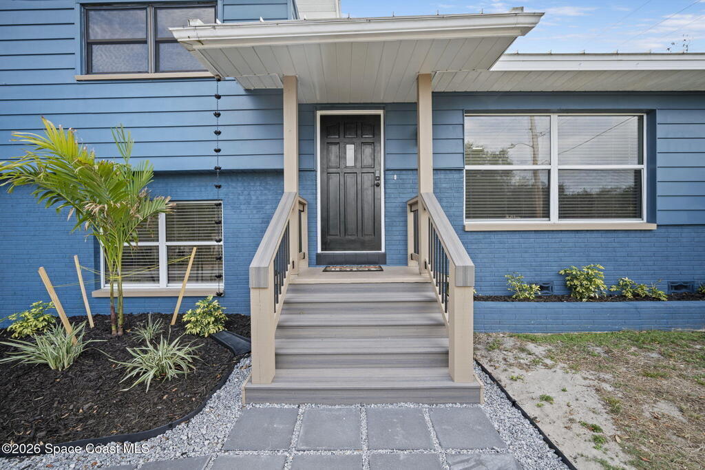 Beautifully updated and move in ready in the highly desired neighborhood of River Heights, with close access to US1 and 528. The feeling of ''Home'' springs to life the minute you walk in the front door with a bright and open floor plan leading to the kitchen with grey shaker cabinetry, butcher block counters, center island, and newer stainless steel appliances. Upstairs you will find 3 generous bedrooms, 2 recently updated bathrooms, with the primary en suite offering a walk in closet, balcony/Florida room and the bathroom boasting luxury finishes. Downstairs you will find a separate office/den space, 4th bedroom, and laundry room, all lined with vinyl plank flooring. Outside the fun never ends with custom raised entertaining deck that is perfect for a fire pit, spacious pool, outdoor shower, and vinyl fenced in yard. 2011 Metal Roof, 2025 AC and duct work, New Insulation, 2018 Paid Off Solar, 2020 Water Heater, Updated Elec Panel, Copper Wiring, No Popcorn Ceilings, and More