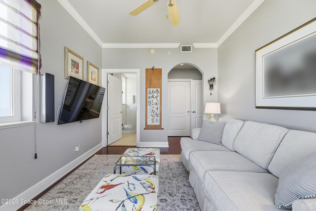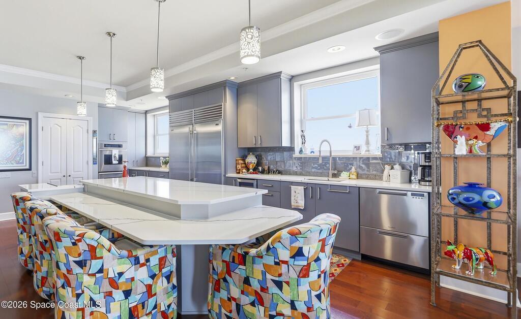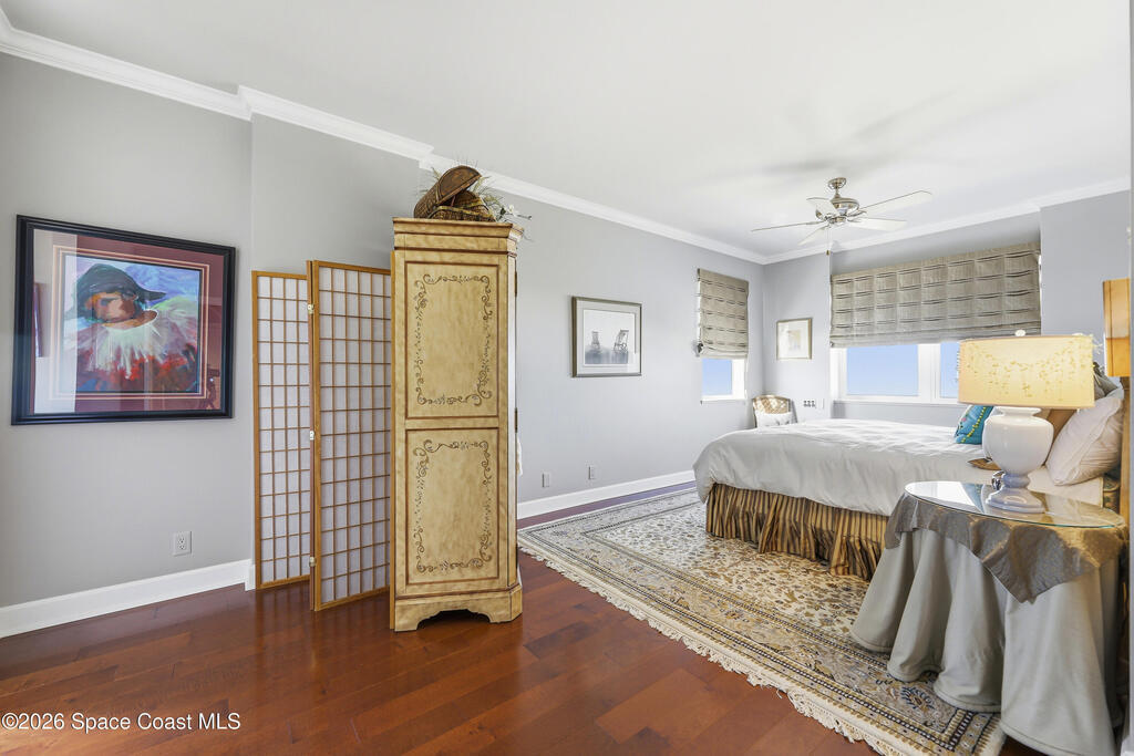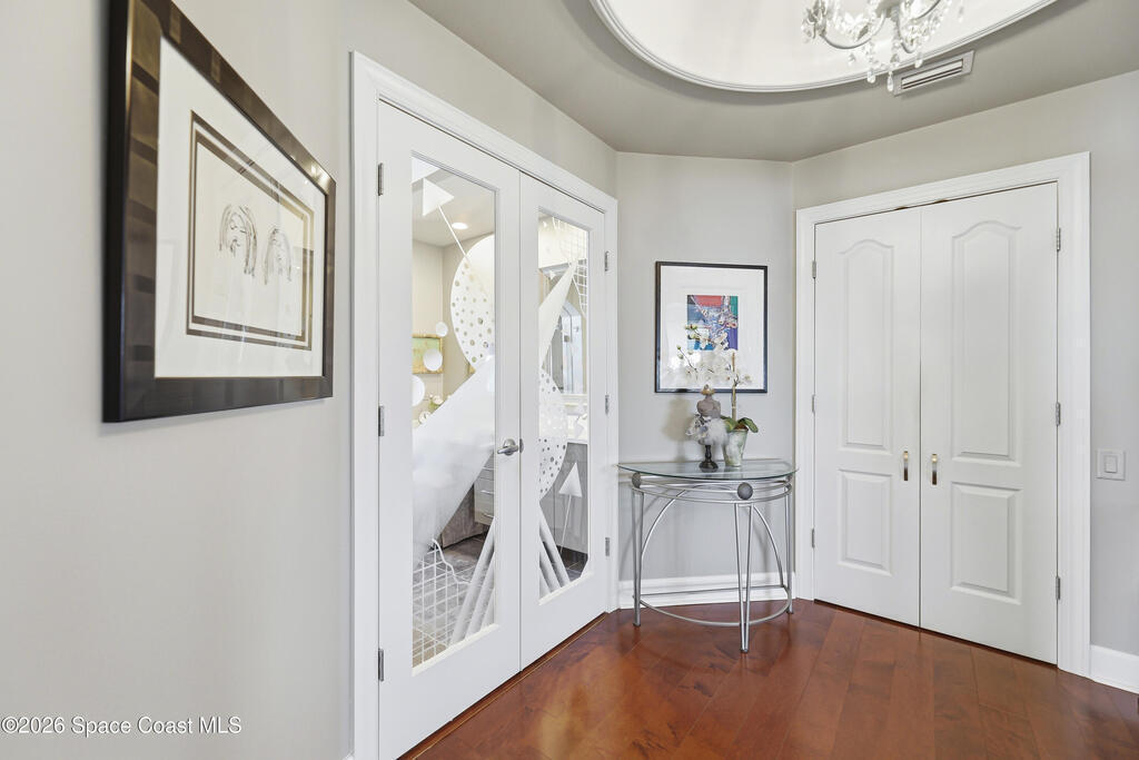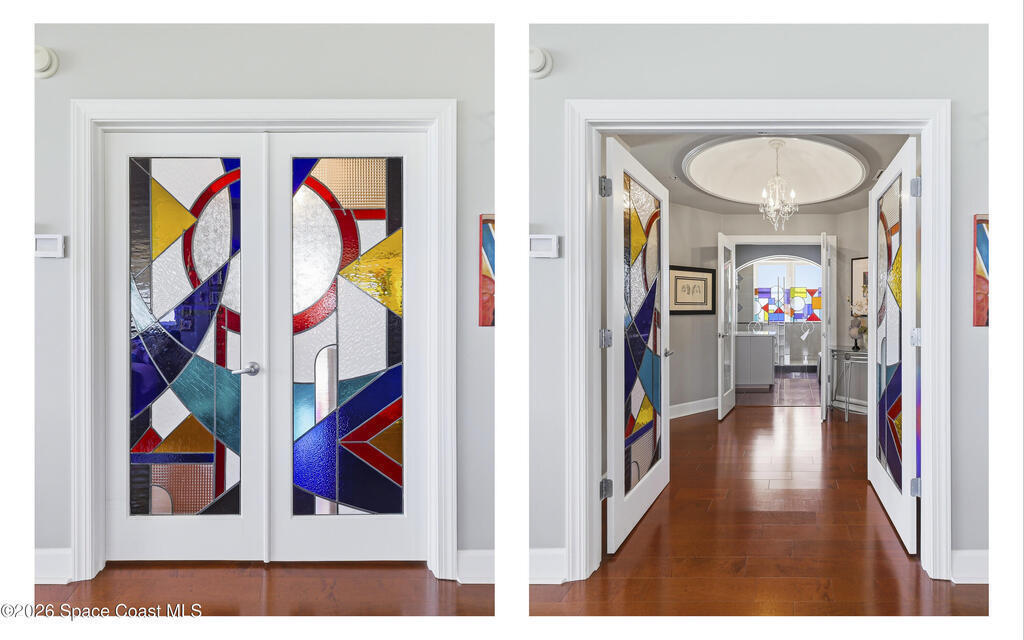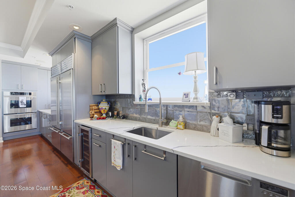 The Pinnacle of Riomar: Full-Floor Oceanfront PenthouseExperience unmatched privacy with a secure elevator directly accessing your private foyer. This full-floor, 3, 009 sq ft residence offers 360 views--from Atlantic sunrises to Banana River sunsets--making it a rare, fully customized top-floor opportunity.This 3-bedroom, 3.5-bath home features 10-foot ceilings, hardwood floors, and expansive living areas with a wine bar and two wine coolers. The chef's kitchen includes: two Sub-Zero refrigerators, Thermador double ovens, Samsung cooktop, and Fisher & Paykel double drawer dishwasher.The floor plan is designed for flow and privacy: open kitchen and dining area maximizes light and water views and has powder room. Each bedroom has an view, en-suite bath, plus custom closets.Enjoy a private oceanfront balcony, motorized hurricane shutters, private garage + extra parking, and new HVAC/water systems. Boutique community with pool, security, and all-inclusive fees.