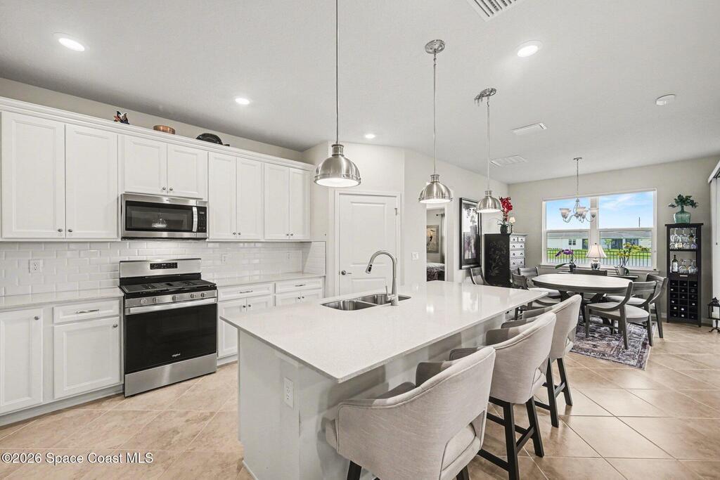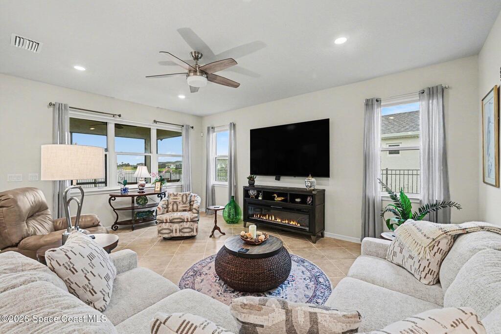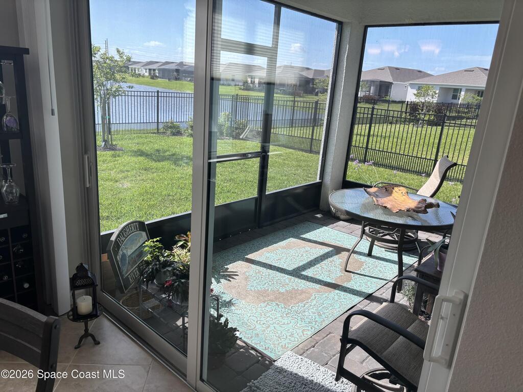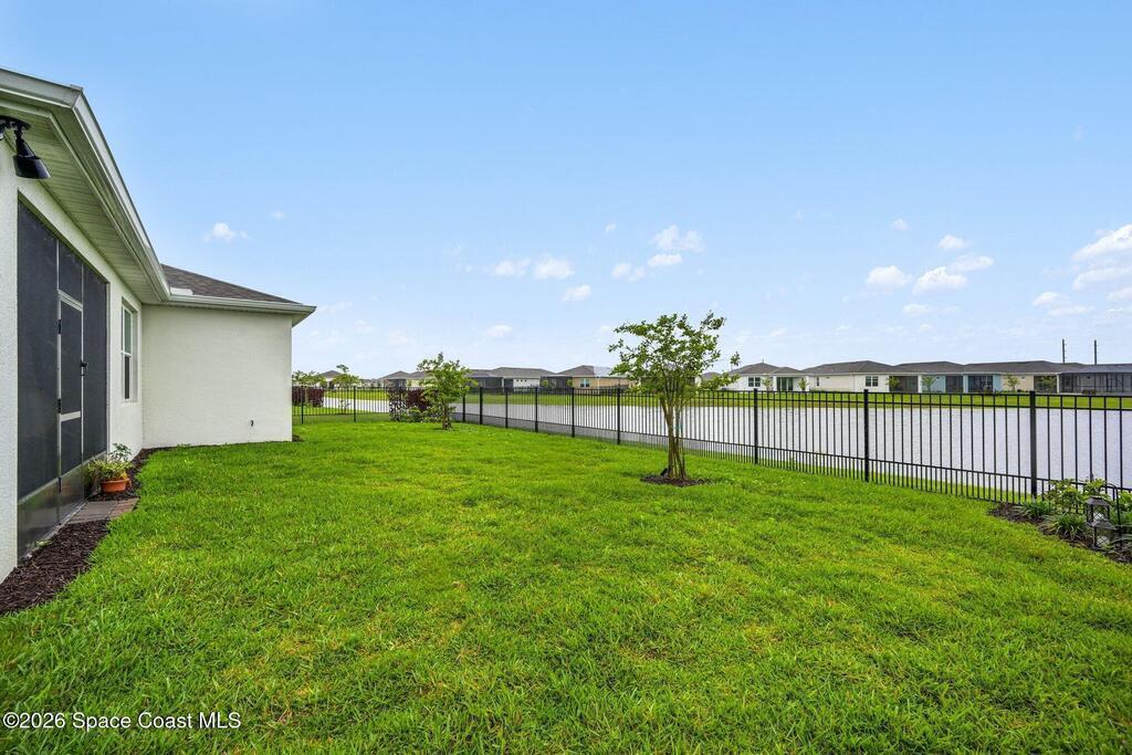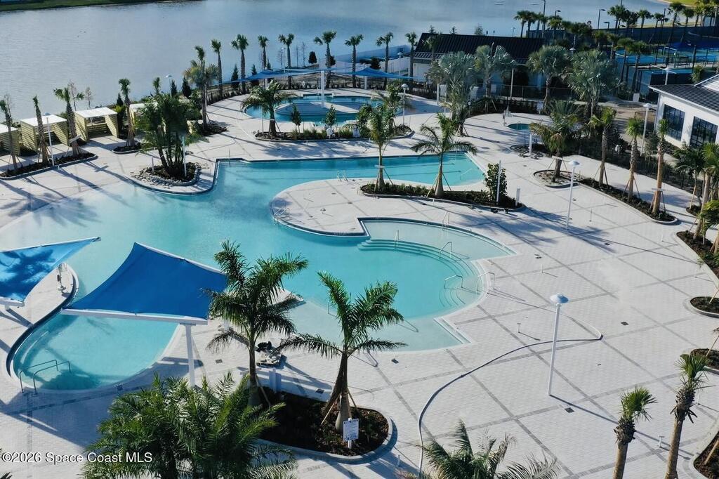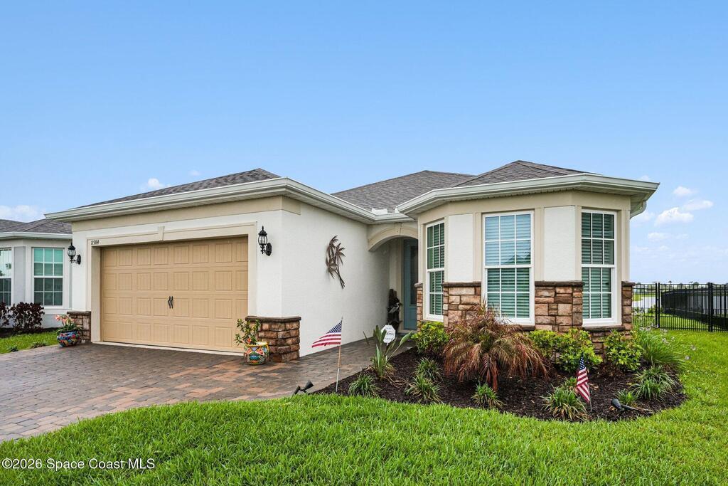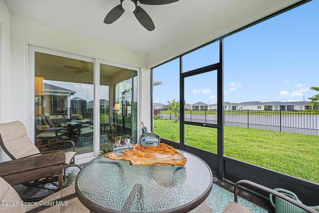 This lakefront, oversized premium lot has 3 full bedrooms and 2 full baths. This is a favorite Del Webb model called Mystique. You can enjoy from your screened lanai amazing sunset & unobstructed water views. It is move in ready for you to start enjoying life in an active resort-style community. Entertaining is easy with a large open concept gathering room, kitchen with large island, and cafe. Included are window treatments, ceiling fans & lighting fixtures. The upgraded laundry room has both upper, lower cabinets, a large sink & a built-in storage closet. Chef's kitchen has upgrades such as quartz countertops, stainless steel Whirlpool appliances, upgraded sink/faucet, backsplash, and much more. The oversized 2-car garage with epoxy flooring was extended by 4 feet & has an additional tandem space for parking your golf cart. Ceramic tile flooring throughout the home. Fire alarm & security systems are installed. The yard is private with its iron fence & puppy picket for your pet.