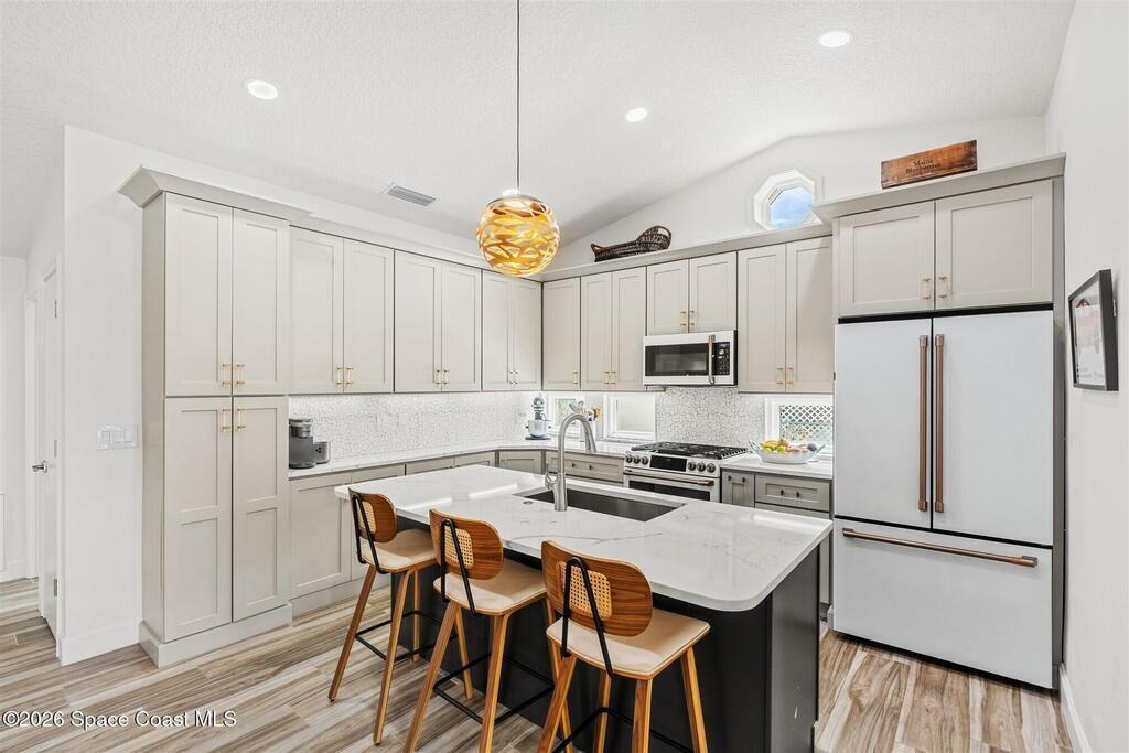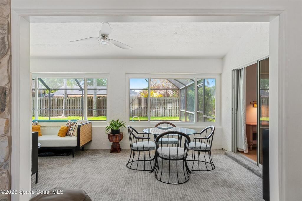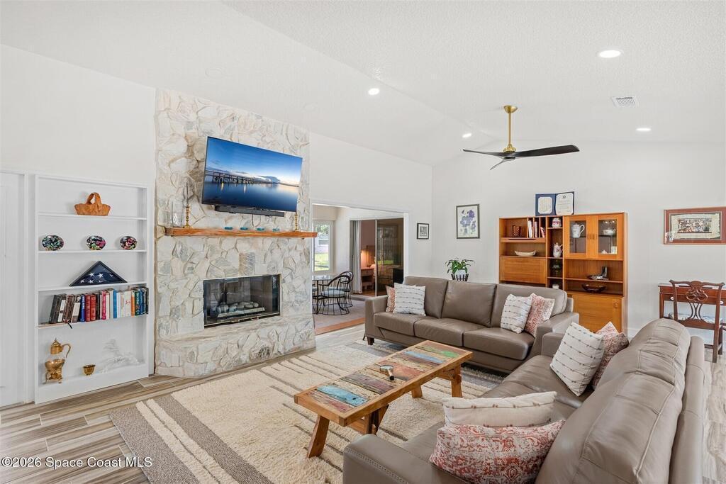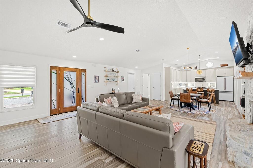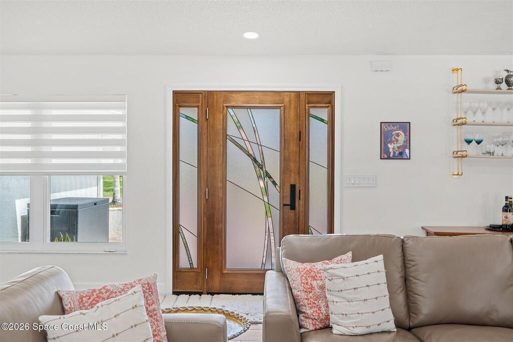 SELLER HAS ASSUMABLE VA MORTGAGE AT 2.25%. Located in the highly sought-after Crystal Lake community of Suntree, this fully remodeled, move-in ready 3-bed, 2.5 bath pool home with a 2-car garage offers the perfect combination of modern upgrades, thoughtful design, and long-term peace of mind. From the moment you arrive, the charming paved front courtyard creates a warm and inviting entry, setting the tone for the quality found throughout. Inside, the open floor plan is filled with natural light and enhanced by new flooring throughout, updated baseboards, recessed LED lighting, and designer ceiling fans. The spacious living area features a cozy gas fireplace and flows seamlessly into the dining and kitchen spaces, making it ideal for both everyday living and entertaining. The beautifully updated kitchen serves as the heart of the home, showcasing quartz countertops, new cabinetry, a stylish backsplash, and high-end appliances. A new washer and dryer add convenience, while (more)