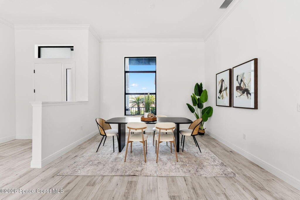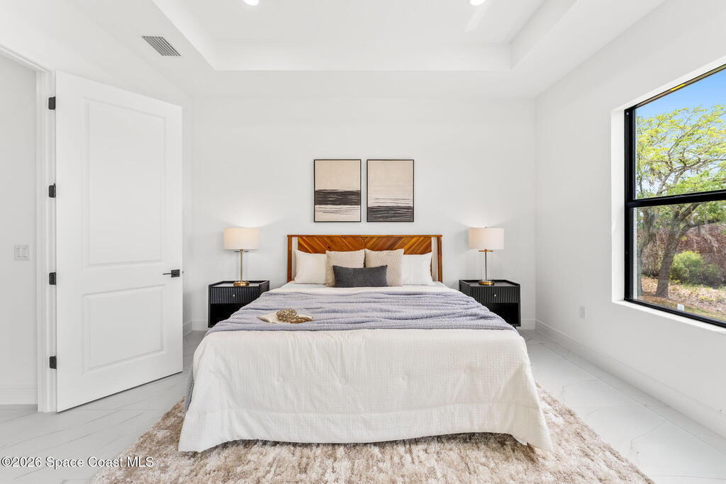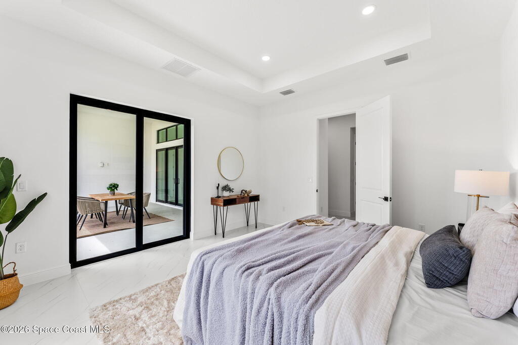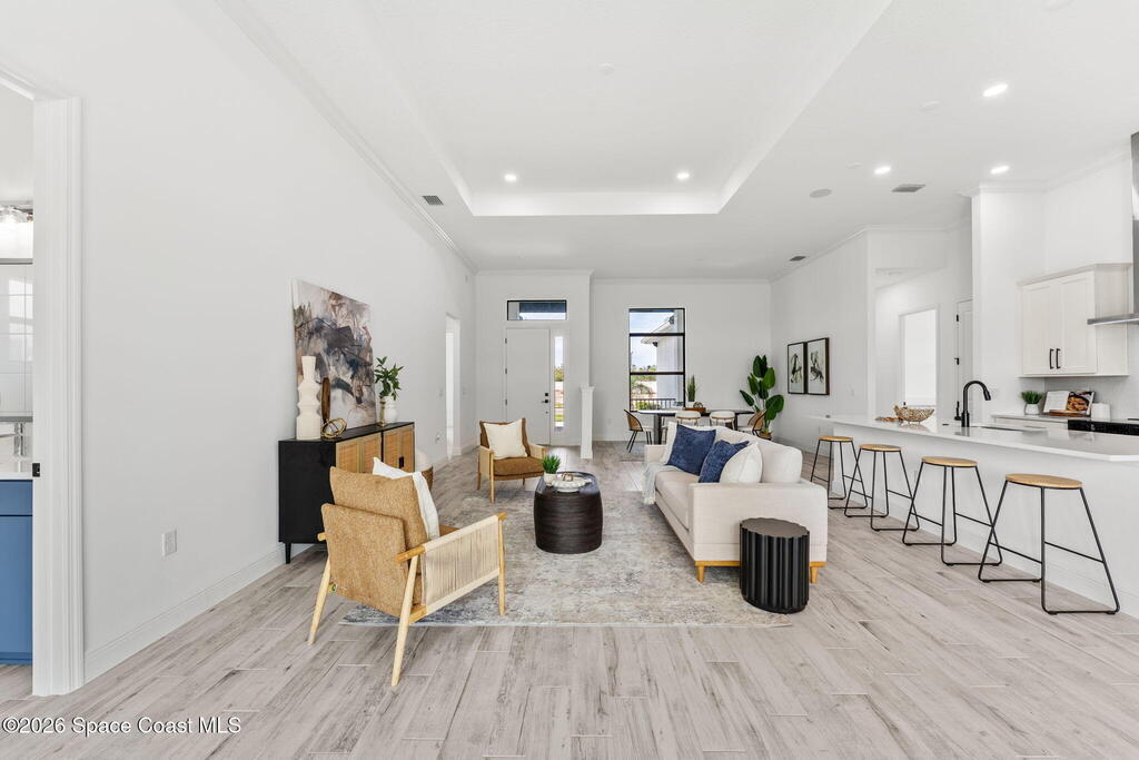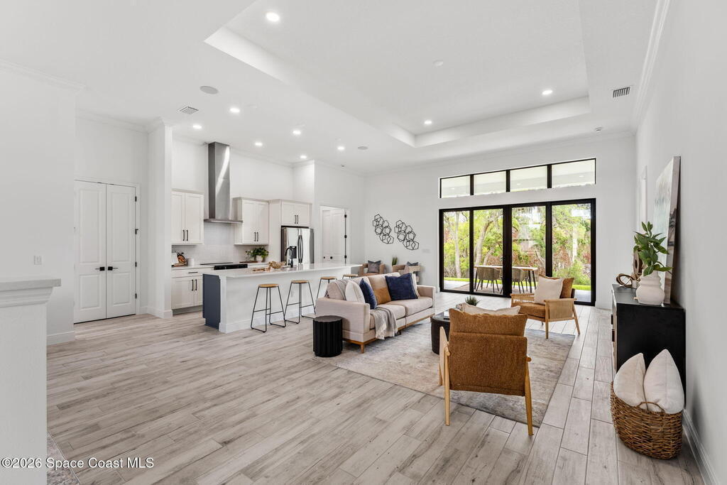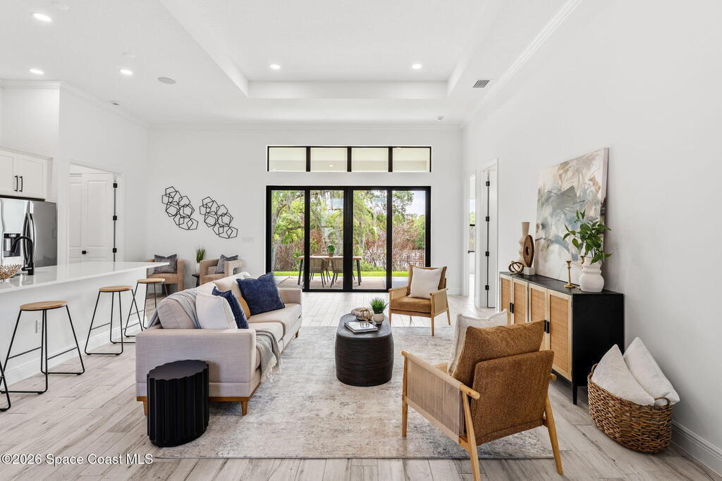 Poised along the Eau Gallie River, this newly constructed 4-bed, 3-bath residence offers a thoughtful balance of craftsmanship, comfort, & understated luxury across 2, 400 sq ft. Framed by tranquil conservation views & complemented by a shared dock w/ the opportunity to secure a private boat slip, the setting invites a seamless connection to the water. W/in a gated enclave defined by manicured grounds, green space, & resort-style amenities, the home reflects a refined approach to modern living, featuring 10' ceilings, 8' six-panel doors, impact windows, plank tile flooring, & a well-appointed kitchen w/ premium appliances & soft-close cabinetry. Spa-inspired baths w/ floor-to-ceiling tile enhance the sense of retreat, while a pavered driveway & fresh landscaping create a polished first impression. The backyard offers both privacy & potential, w/ room for a pool or expanded outdoor living overlooking the river. Just moments from Eau Gallie Arts District, beaches, Melbourne Airport & I-95